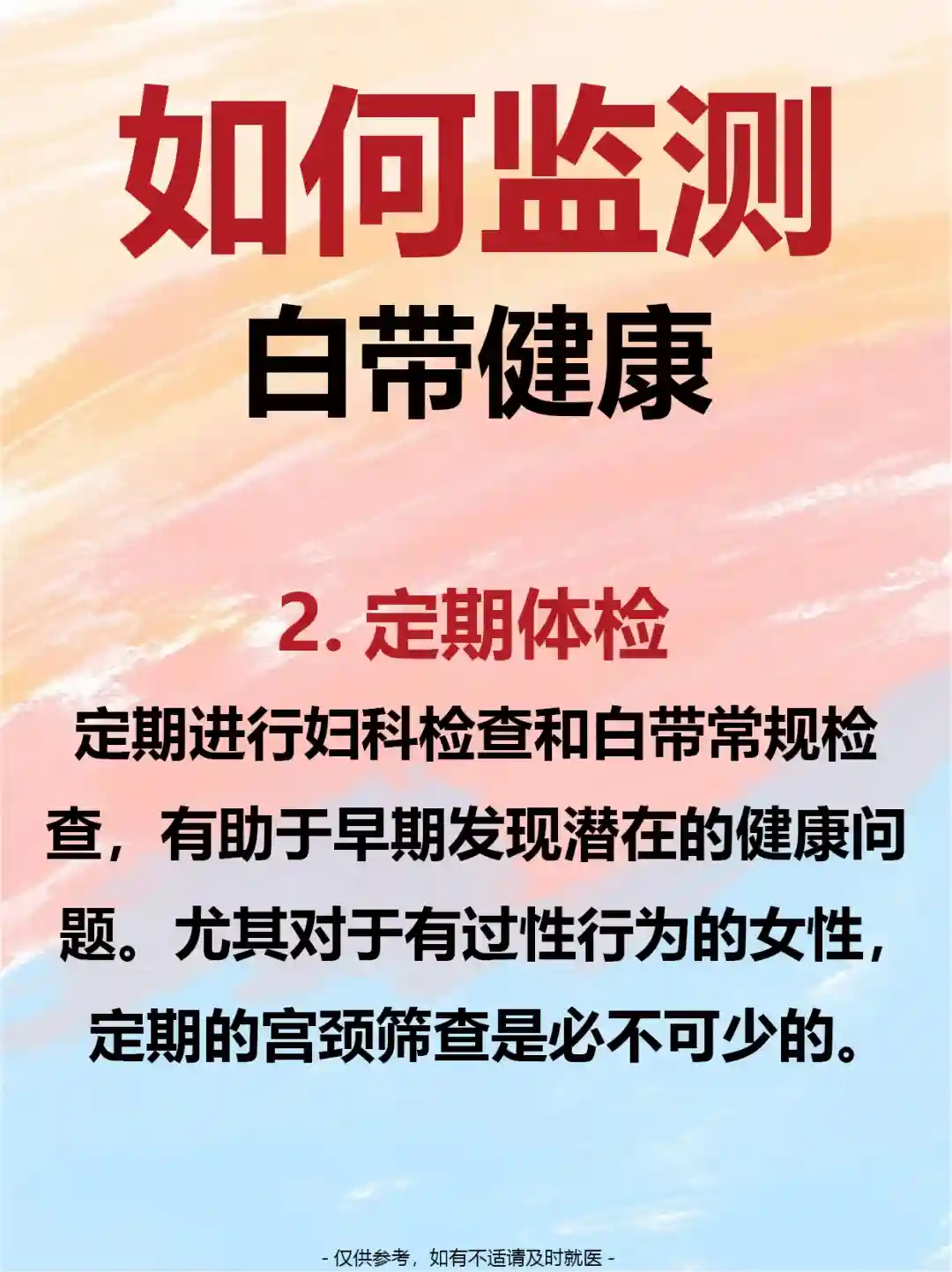 定期进行妇科检查和白带常规检查,有助于早期发现潜在的健康问题。尤其对于有过性行为的女性,定期的宫颈筛查是必不可少的。