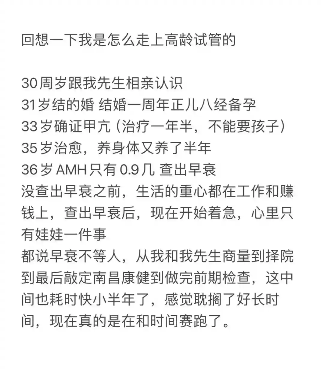 36岁AMH只有0.9几 查出早衰没查出早衰之前,生活的重心都在工作和赚钱上,查出早衰后,现在开始着急,心里只有娃娃一件事