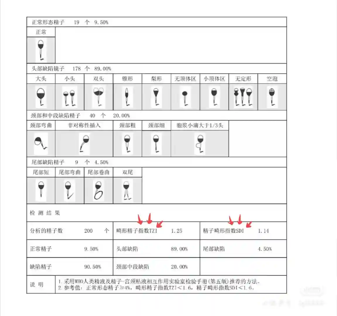2. 畸形精子指数(TZI):这个一指数计算的是缺陷总数与畸形精子数的, 比值。TZI只记录每个精子的四种缺陷:头部、颈部、尾部及是否含有过大的残留胞浆小滴,而不去记录是否还存在有其它方面的异常。TZI的正常范围是1.2以下,如果TZI值大于1.6,则提示未经治疗不育夫妇的生育率低。这两个指数提供了有关男性生育能力的初步信息,但仅通过SDI和TZI不能完全判断男性生育能力,还需要综合考虑其他因素,如精子活力、密度等。