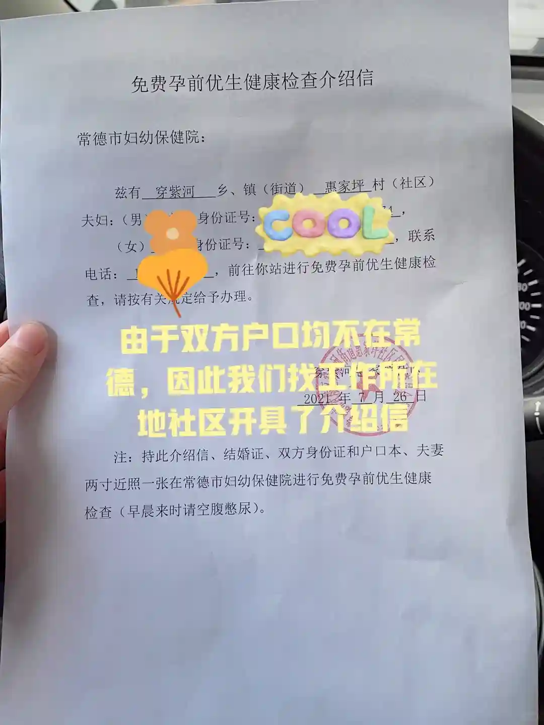 2️⃣由于我跟老公户口都不在常德,因此要去工作或住所所在地社区开具介绍信(在此要感谢惠家坪社区的孙主任为我快速办理好介绍信)。