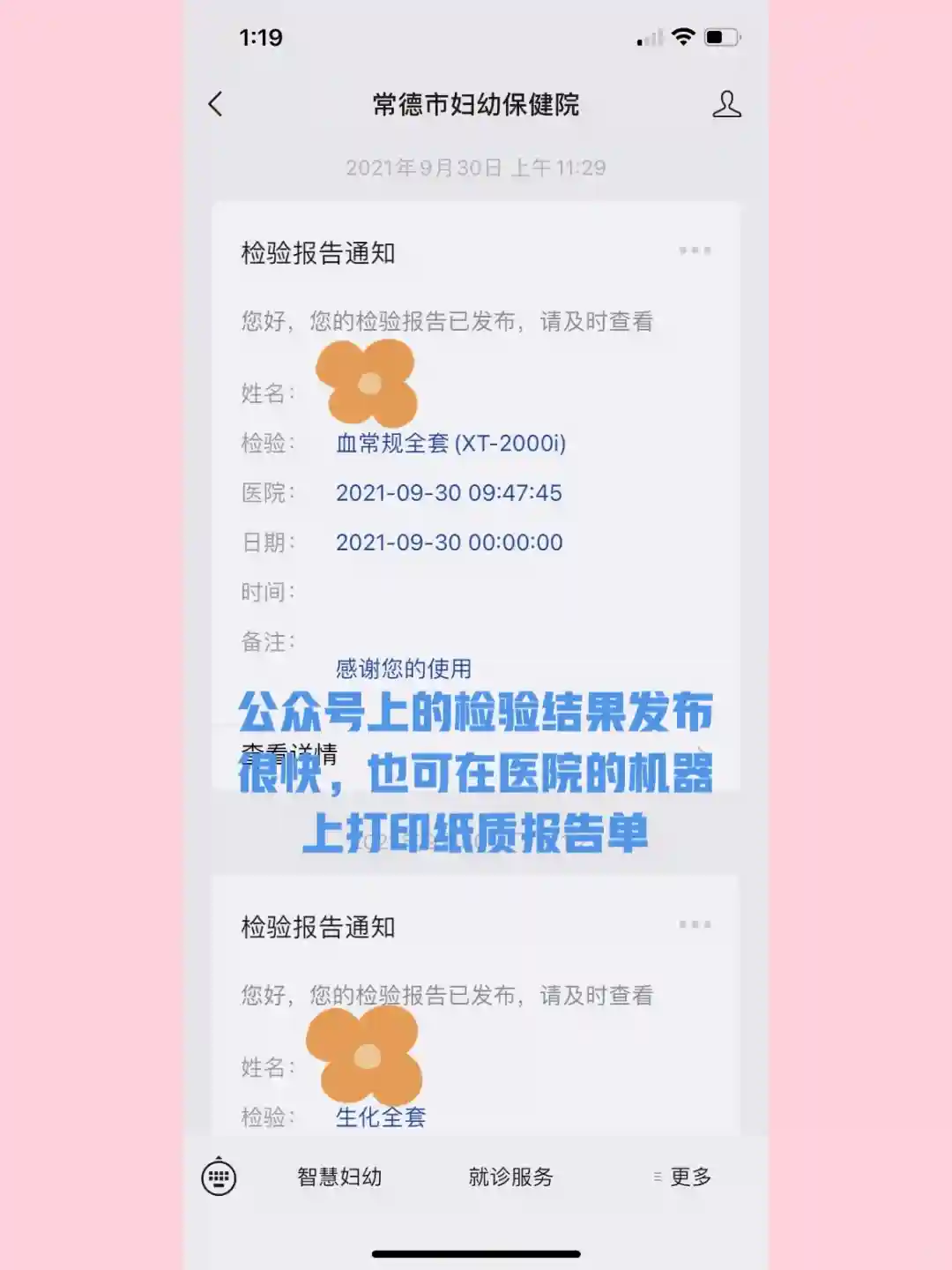 1️⃣有些检查结果当场在公众号上就可以查看,也可以在机子上打印出来,有些则要过几天才发布。