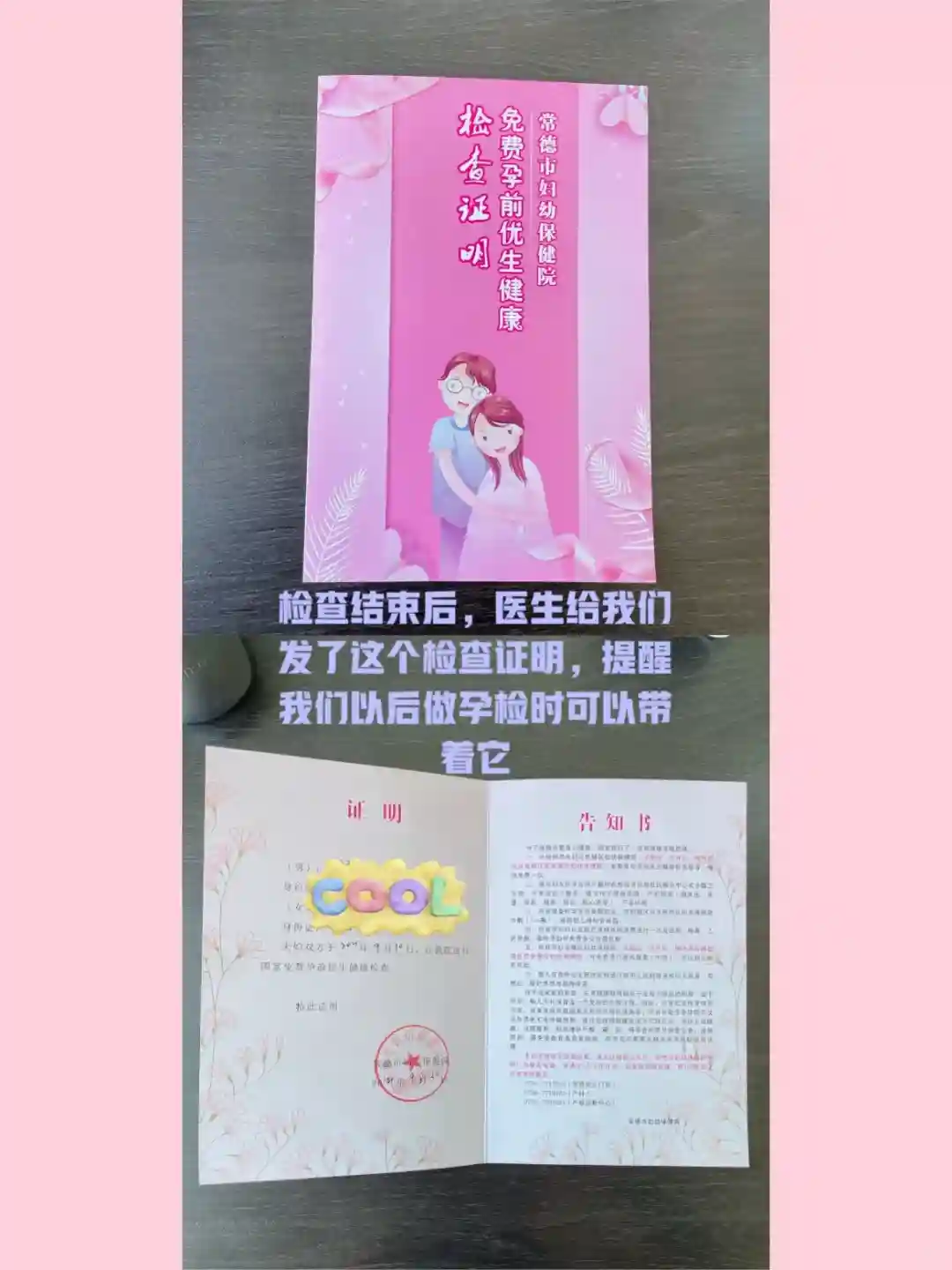 3️⃣检查结果显示,我和老公身体健康,可以备孕二胎,医生给我们讲解了一些备孕注意事项,提醒我尽早开始服用叶酸,并发给我们一个“免费孕优检查证明”。至此,检查圆满完成。