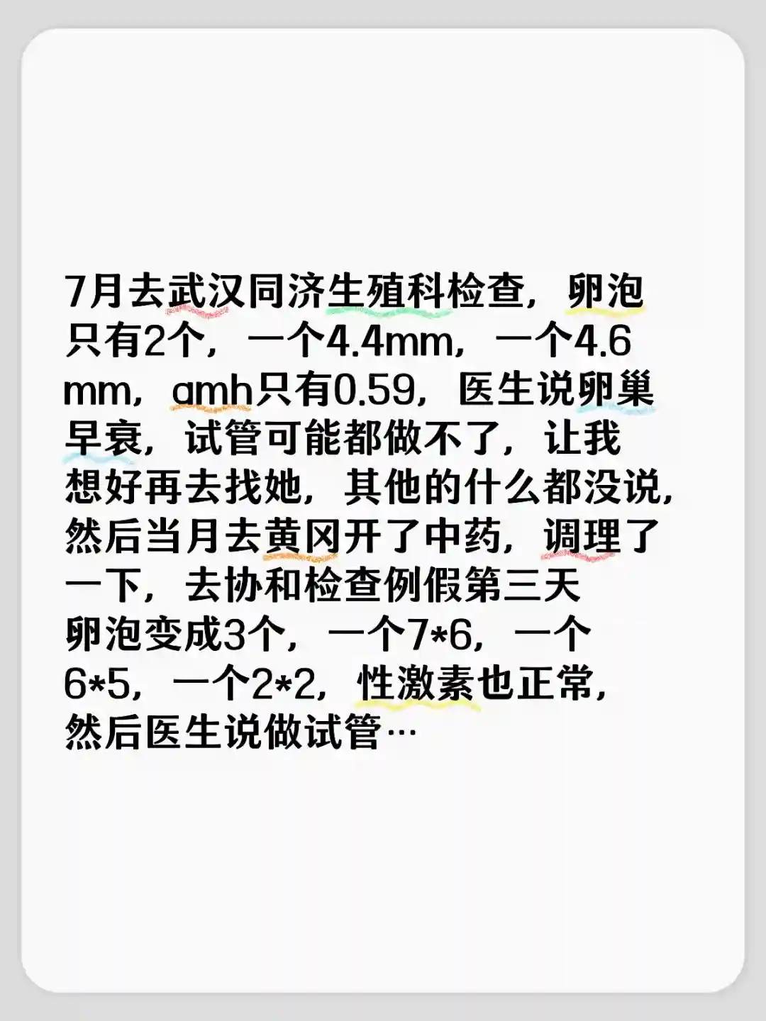 7月去武汉同济生殖科检查,卵泡只有2个,一个4.4mm,一个4.6mm,amh只有0.59,医生说卵巢早衰,试管可能都做不了,让我想好再去找她,其他的什么都没说,然后当月去黄冈开了中药,调理了一下,去协和检查例假第三天卵泡变成3个,一个7*6,一个6*5,一个2*2,性激素也正常,然后医生说做试管,开了一个月的地屈酮和辅酶q10,dhea,9月来例假超级多,肚子超级痛,然后血块特别大,以前从来没有过这样,检查卵泡3个变成2个,大小变成了3*2,卵巢大小也不一样了,这个月打了5天促排,卵泡还是2个3*3,为什么调的越来越不行了
