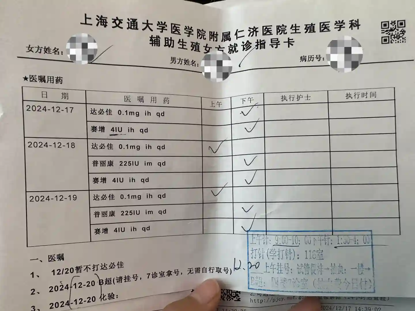 🧣全部做好以后下午在四楼大厅等医嘱就好了,(周一-周五2.30,周六日1.30)广播里会念到名字然后直接过去,护士会给医嘱单(念医嘱的时候我录音了,怕自己记不清,看时间的时候护士看到了说别录她音)
