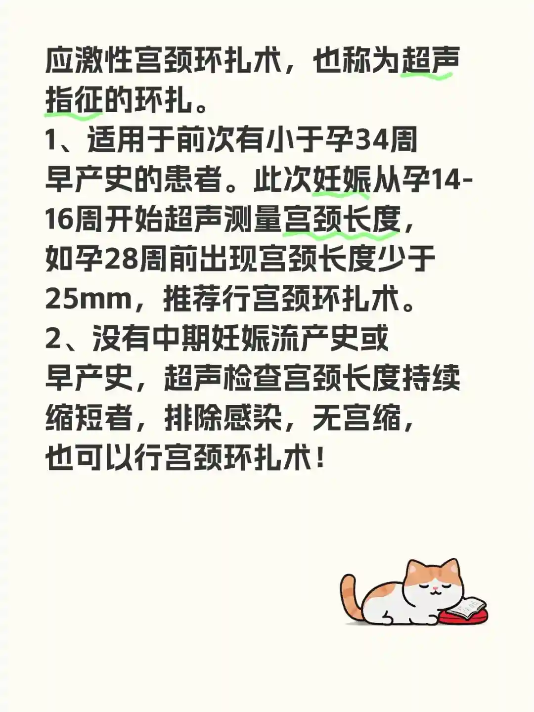 1、适用于前次有小于孕34周早产史的患者。此次妊娠从孕14-16周开始超声测量宫颈长度,如孕28周前出现宫颈长度少于25mm,推荐行宫颈环扎术。