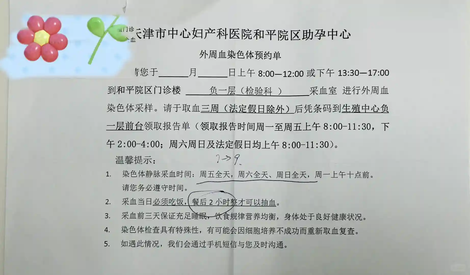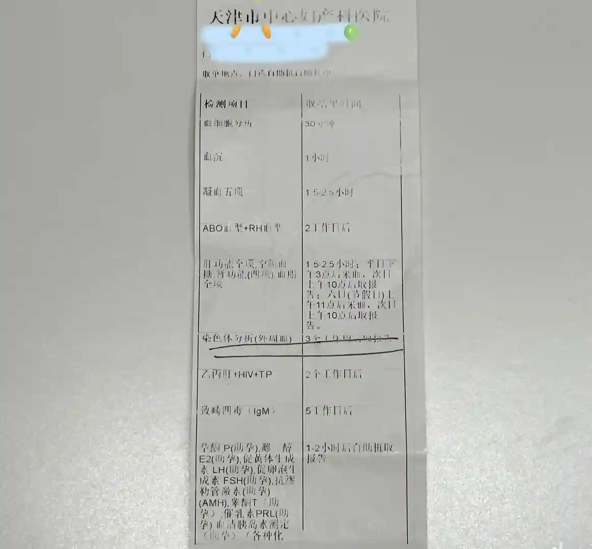 染色体:8.18(周日),因为需要饭后两小时整抽血,妇产医院是每周一10点前或者周五、周六、周日全天可做,当天过了10点,所以改到了8.18去做的,3周出结果,9.8取结果。