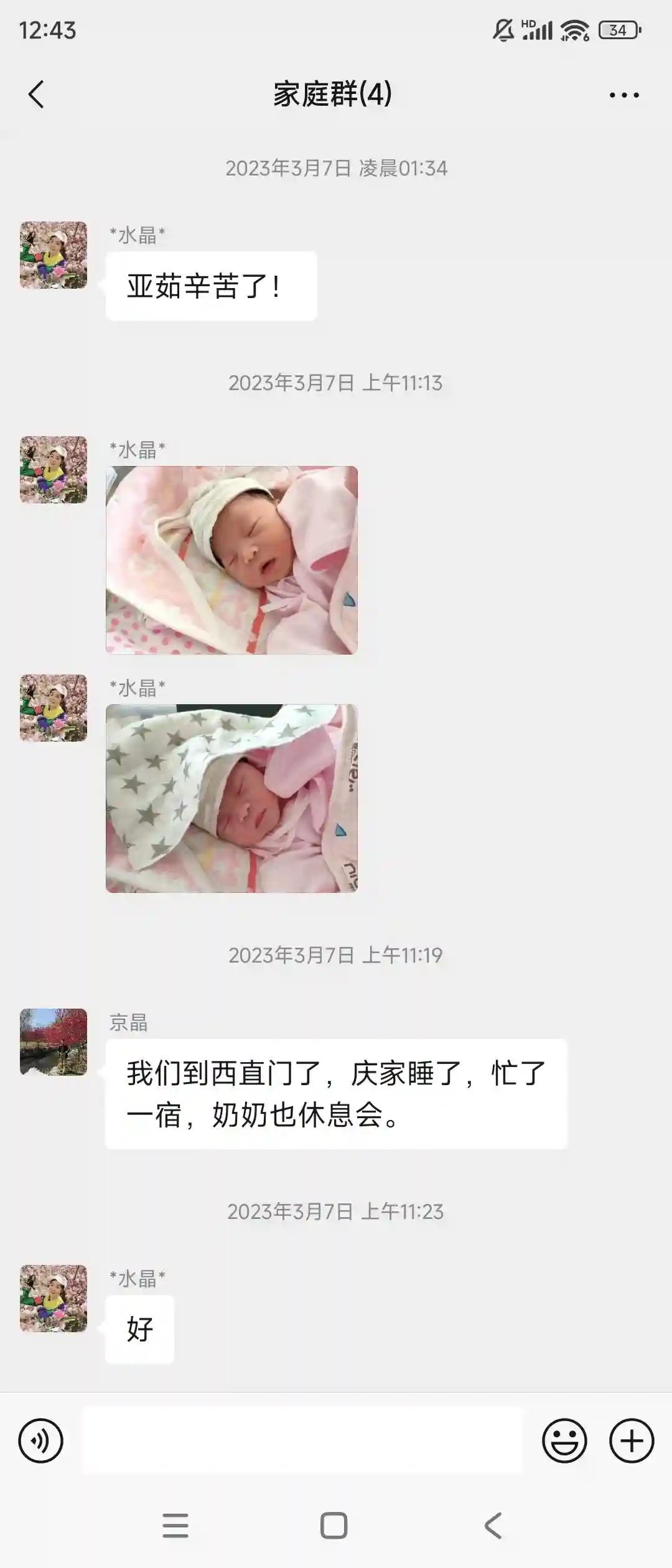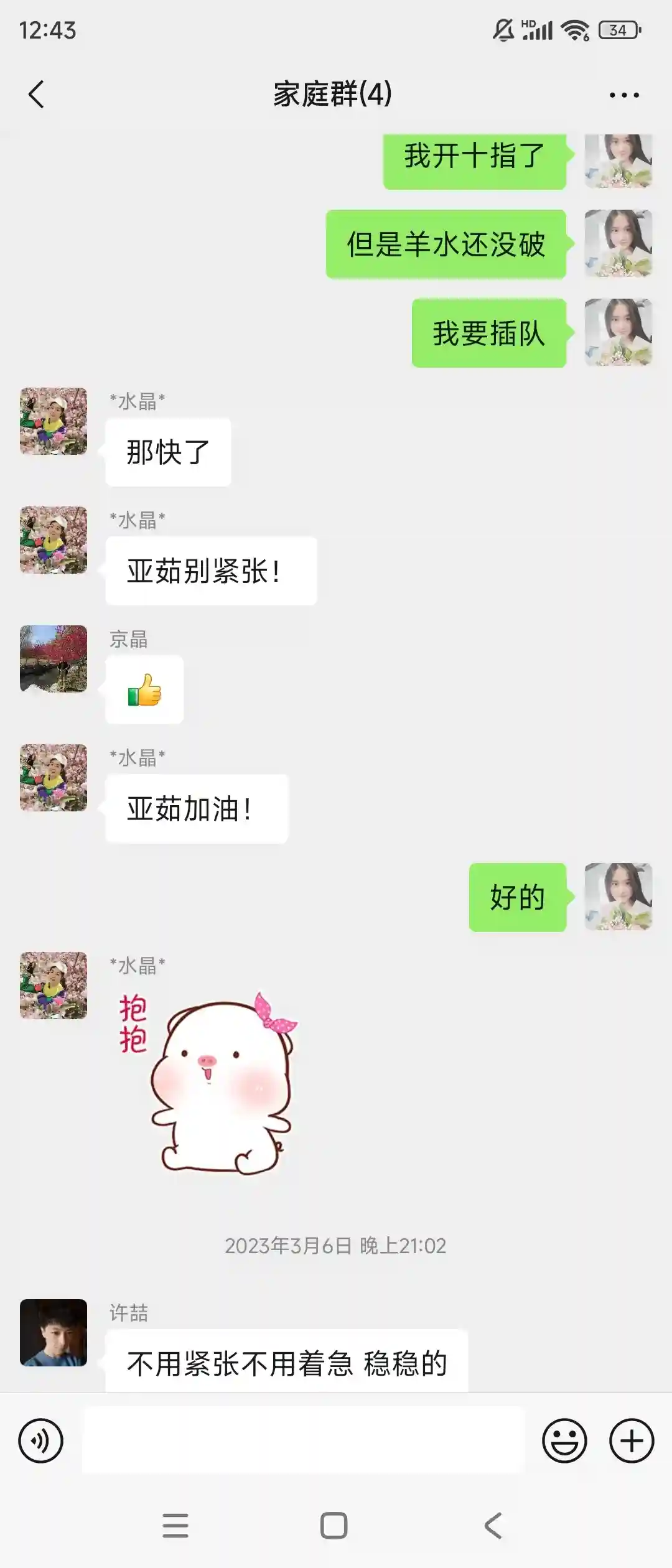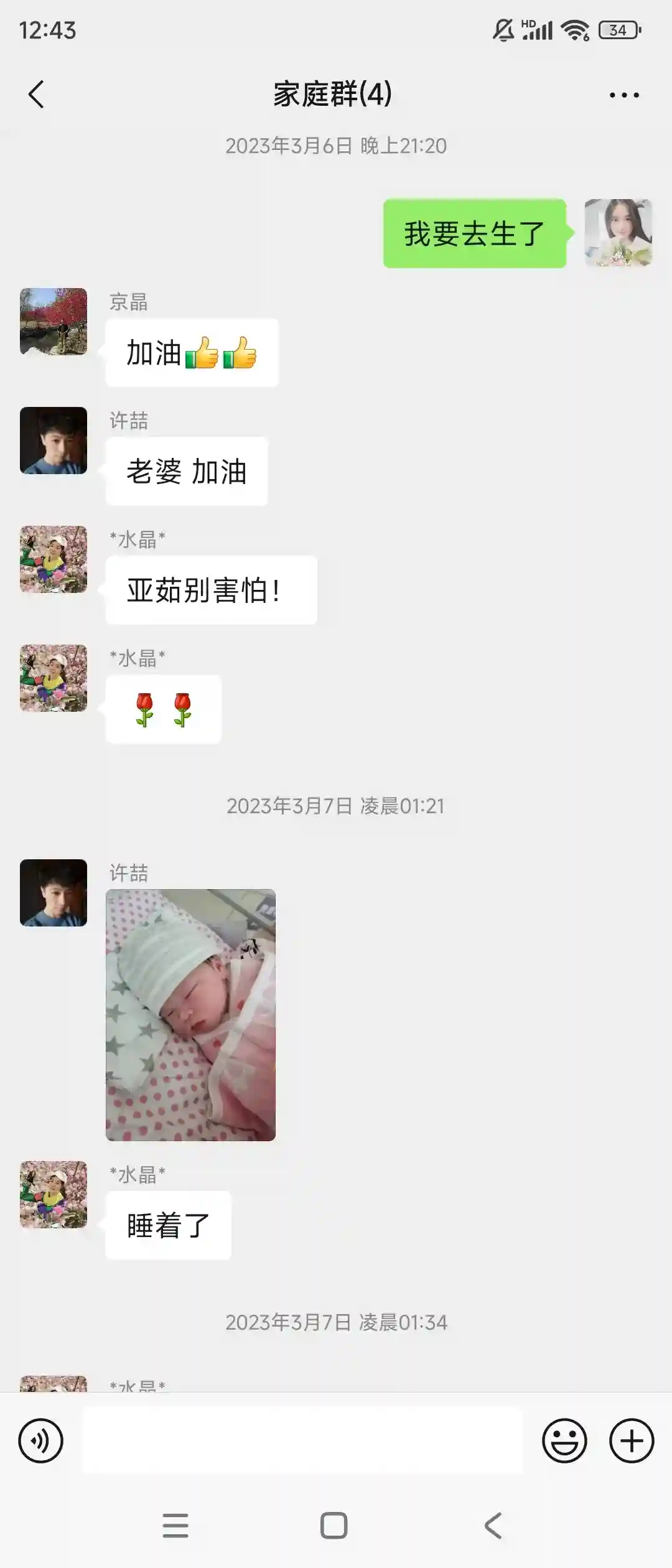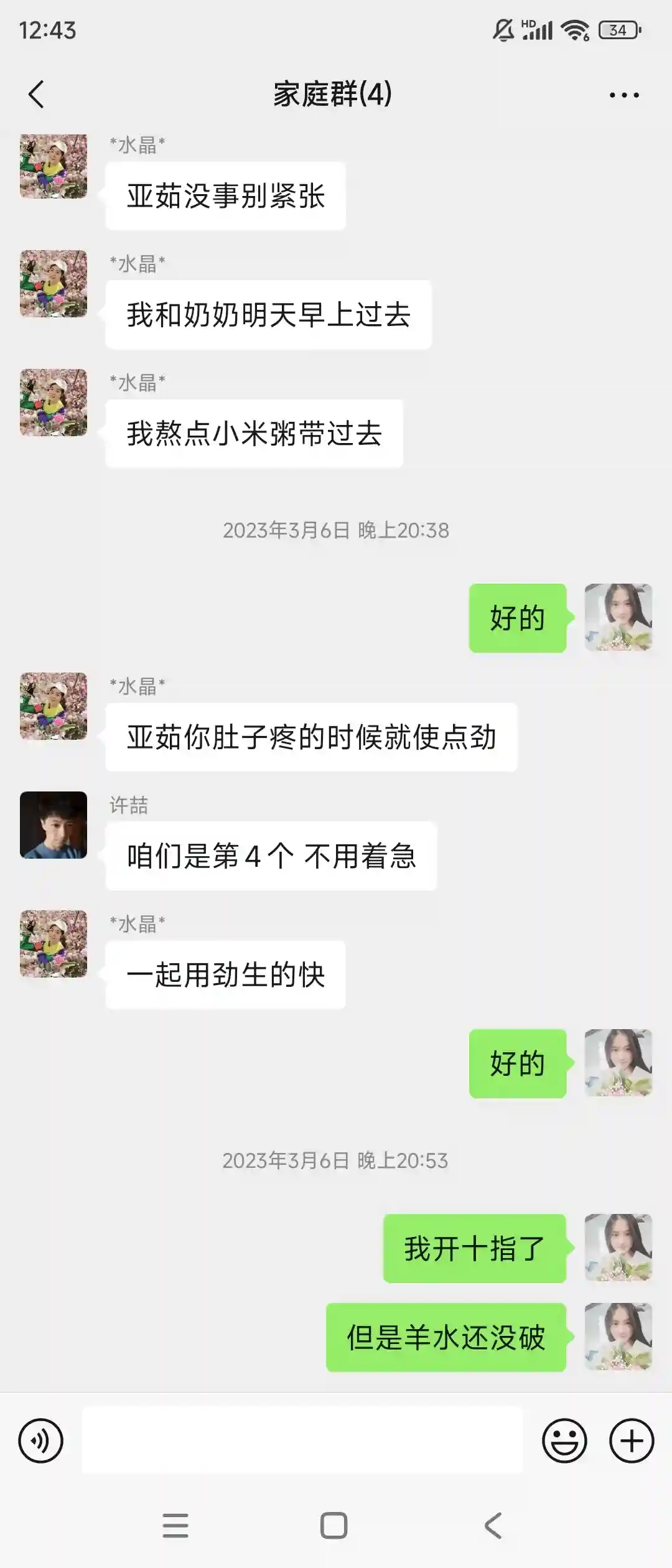 7.得益于生之前我老公每天陪着我走一万步,所以生产过程格外顺利,3月6号早晨7点左右见红,然后开始洗澡准备出发去医院,下午3点15开指1指半了,婆婆当时阳了在家里观察,我老公和我公公在产房外等待,我妈和我哥坐高铁从石家庄赶在我生之前到了海淀医院。开指后宫缩开始疼痛有点难以忍受,打了无痛之后瞬间感觉活过来了,无痛的2000块钱千万别省。从下午3点多到晚上9点从开一指到十指,9点20弯道超车被推进产房。我带着两瓶尖叫和脉动开始生产。我老公在产房外去给我买了红牛和巧克力给了护士后被给错人了,从头到尾我都没吃上一口。9点20开始生产10点半生下来我闺女,小小的白白的医生放到我身上还能听到她哄哄唧唧的小声音。(生得过程中呼吸和有规律的使劲很重要,不要白白浪费力气)