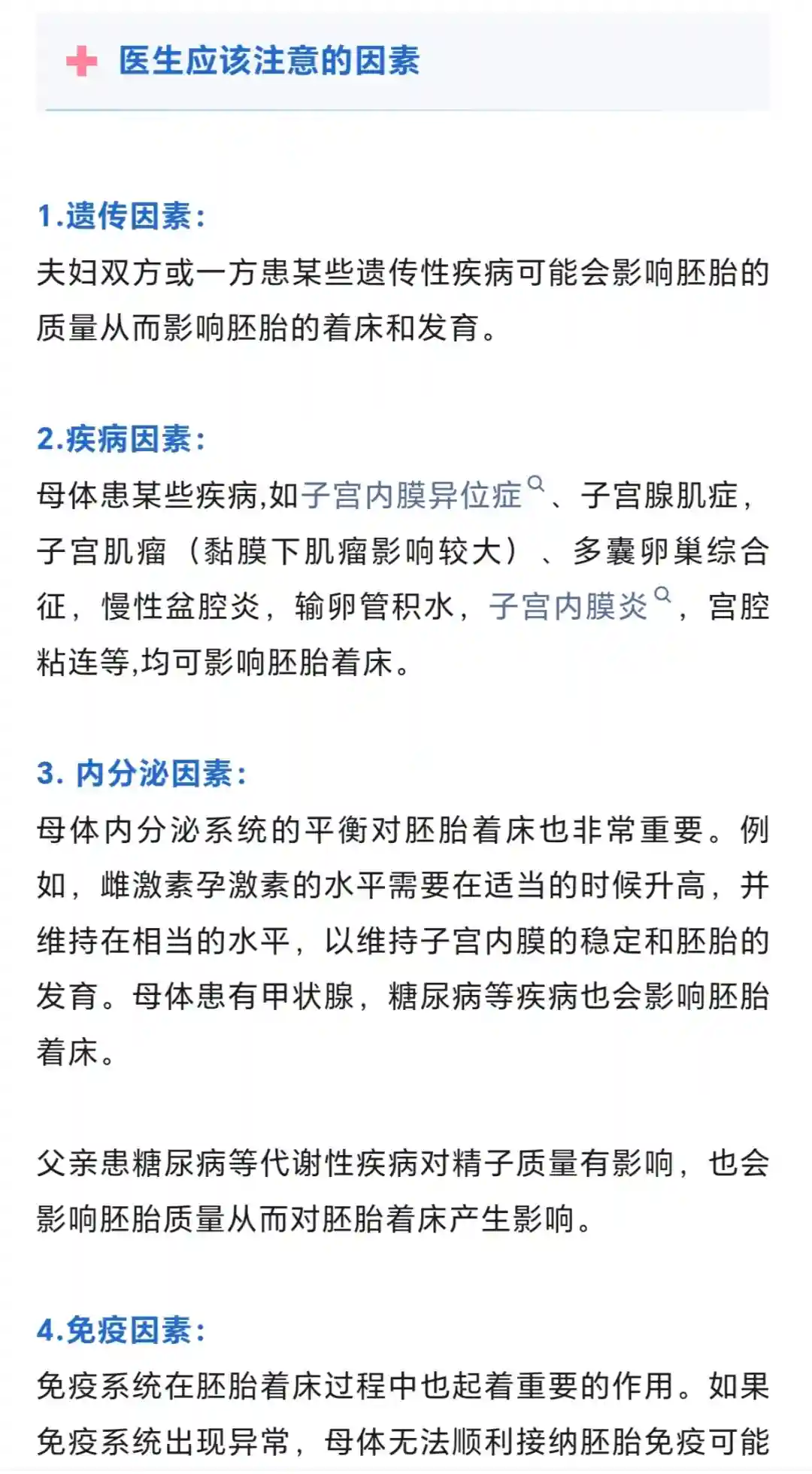 除了父母的遗传因素及疾病因素会影响胚胎的质量, 从而影响胚胎着床。顺利着床胚胎还应具备的因素包括胚胎发育使胚胎表明的透明带消失,滋养细胞分化出合体滋养细胞才能够顺利着床。