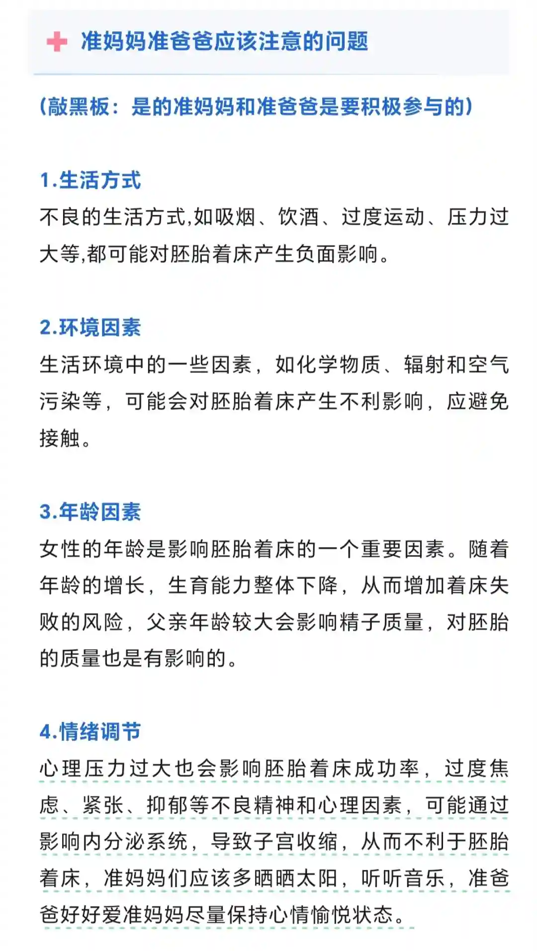 女性的年龄是影响胚胎着床的一个重要因素。随着年龄的增长,生育能力整体下降,从而增加着床失败的风险,父亲年龄较大会影响精子质量,对胚胎的质量也是有影响的。