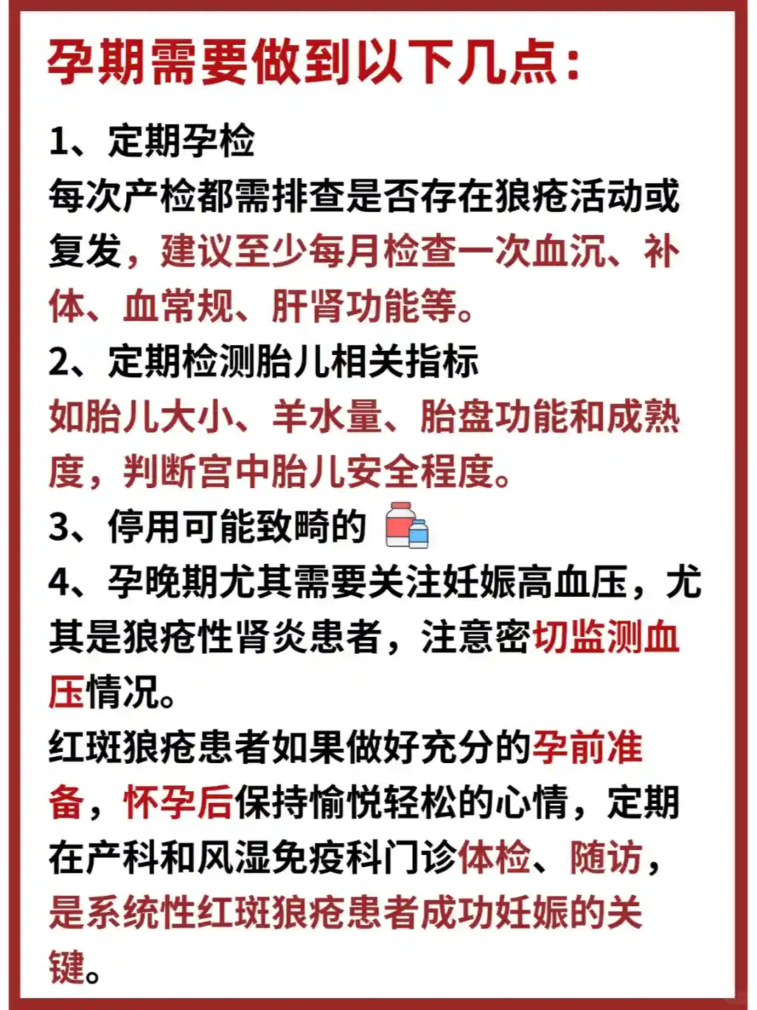 系统性红斑狼疮患者在怀孕期间可能有导致原病情复发风险,同时孕妇可能存在凝血、抗凝等相关用药平衡的评估,尤其是合并抗磷脂抗体阳性者,对孕儿和孕妇二者均会造成生命安全的挑战,因此孕期需要做到以下几点: