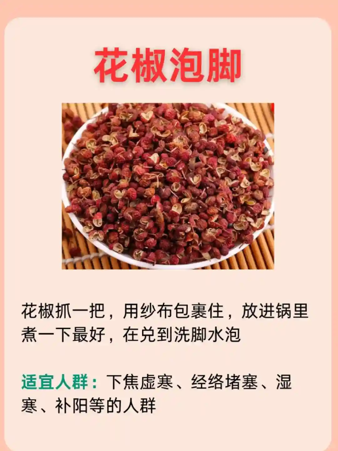 花椒抓一把,用纱布包裹住,放进锅里煮一下,在兑到洗脚水泡