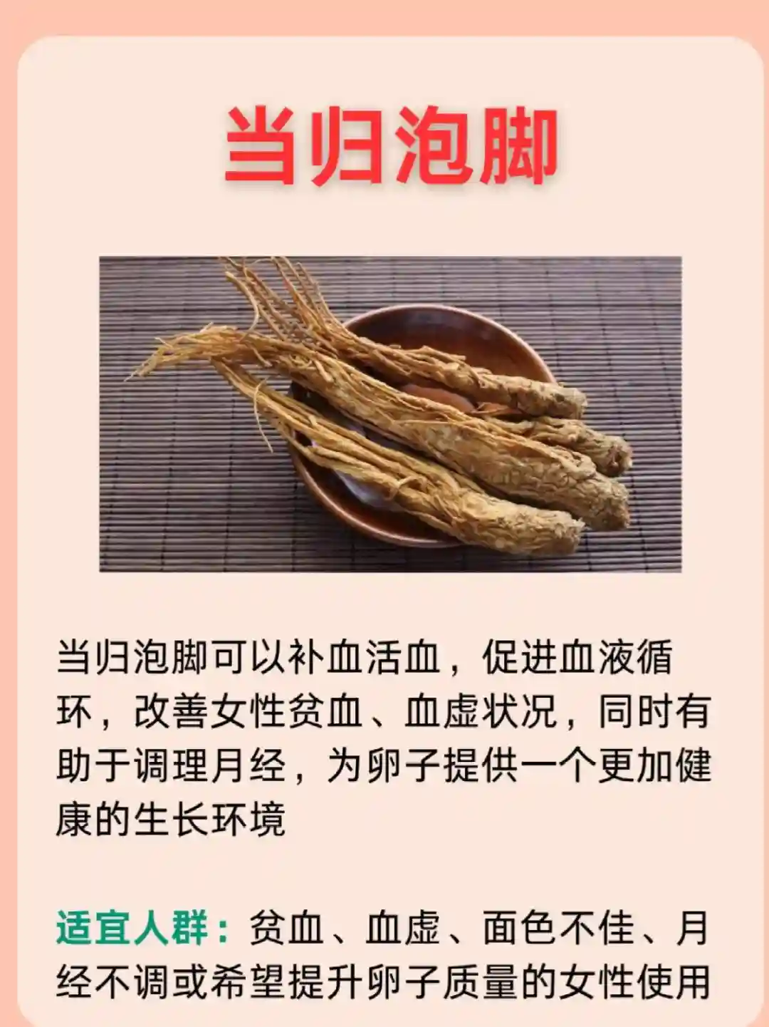 当归泡脚可以补血活xue,促进血液循环,改善女性贫血、血虚状况,同时有助于调理月经,为卵子提供一个更加健康的生长环境
