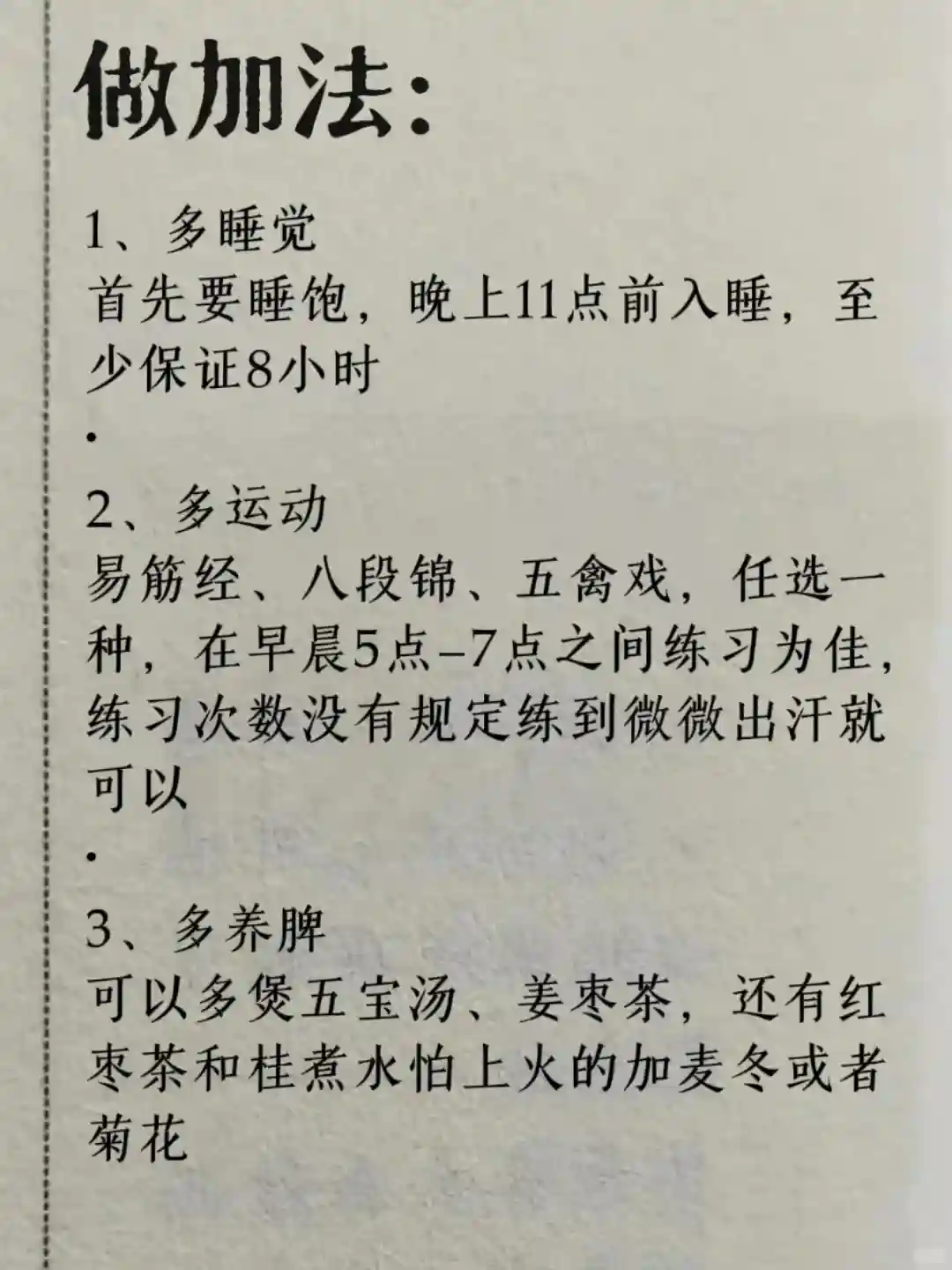 易筋经、八段锦、五禽戏,任选一种,在早晨5点-7点之间练习为佳,练习次数没有规定练到微微出汗就可以