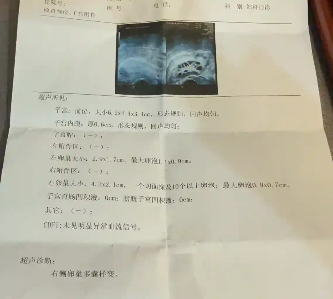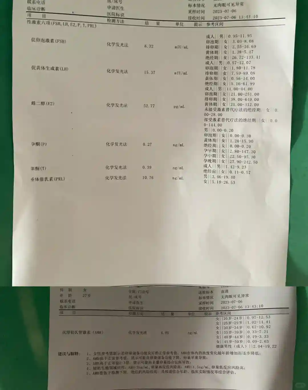 接上文,我是22年10月结婚,因为还没有计划要小孩,所以一直都有采取避孕措施,平时例假时间偶尔会推迟但是没什么异常,直到23年6月计划开始备孕,当时例假已经40多天没来了,而且有不规则出🩸,但是一开始自己也没在意(这里也提醒姐妹们,如果身体有什么不适一定要及时就医,不能拖,很多时候身体出现异常其实就是在提醒自己),23年7月B超检查显示右侧卵巢多囊样变,检查医生跟我说比较难受孕,当时我就感觉天塌了,没想到这样的情况会发生在自己身上,没忍住在医生办公室哭了出来,当然伤心归伤心还是要积极接受治疗🥲。检查出多囊后一起做了肝功、AMH和性激素六项检查,显示AMH值正常,但是FSH和LH值低,因为当时我们就是希望能快点有小宝,所以在咨询了一些医生后,决定选择西医治疗。(图2、3是当时检查的单子)