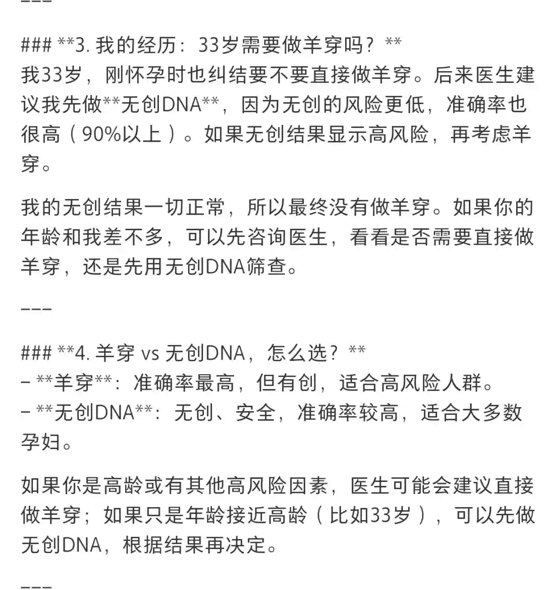 ### **4. 羊穿 vs 无创DNA,怎么选?**- **羊穿**:准确率最高,但有创,适合高风险人群。