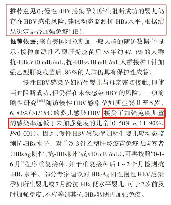 这个指南里说——高乙肝DNA 水平是发生母婴传播的独立危险因素。世界卫生组织(WHO)系统评价显示:乙肝 DNA≥ 2×10^5 IU/mL 孕妇所生婴儿接受联合免疫后的母婴传播率在3. 80% 以上。另一项纳入大样本量的系统评价显示:当分娩前乙肝DNA 水平在 1×10^4 ~2×10^5 IU/mL 时,即使婴儿接受联合免疫仍存在发生母婴传播的风险 ,传播率为0. 6%,高于国内最新“乙肝母婴零传播工程”研究中0. 23%的母婴传播率。推荐意见8:慢性乙肝感染孕妇所生阻断成功的婴儿仍存在HBV感染风险,建议动态监测抗-HBs水平,根据结果决定是否加强免疫(1B)。
