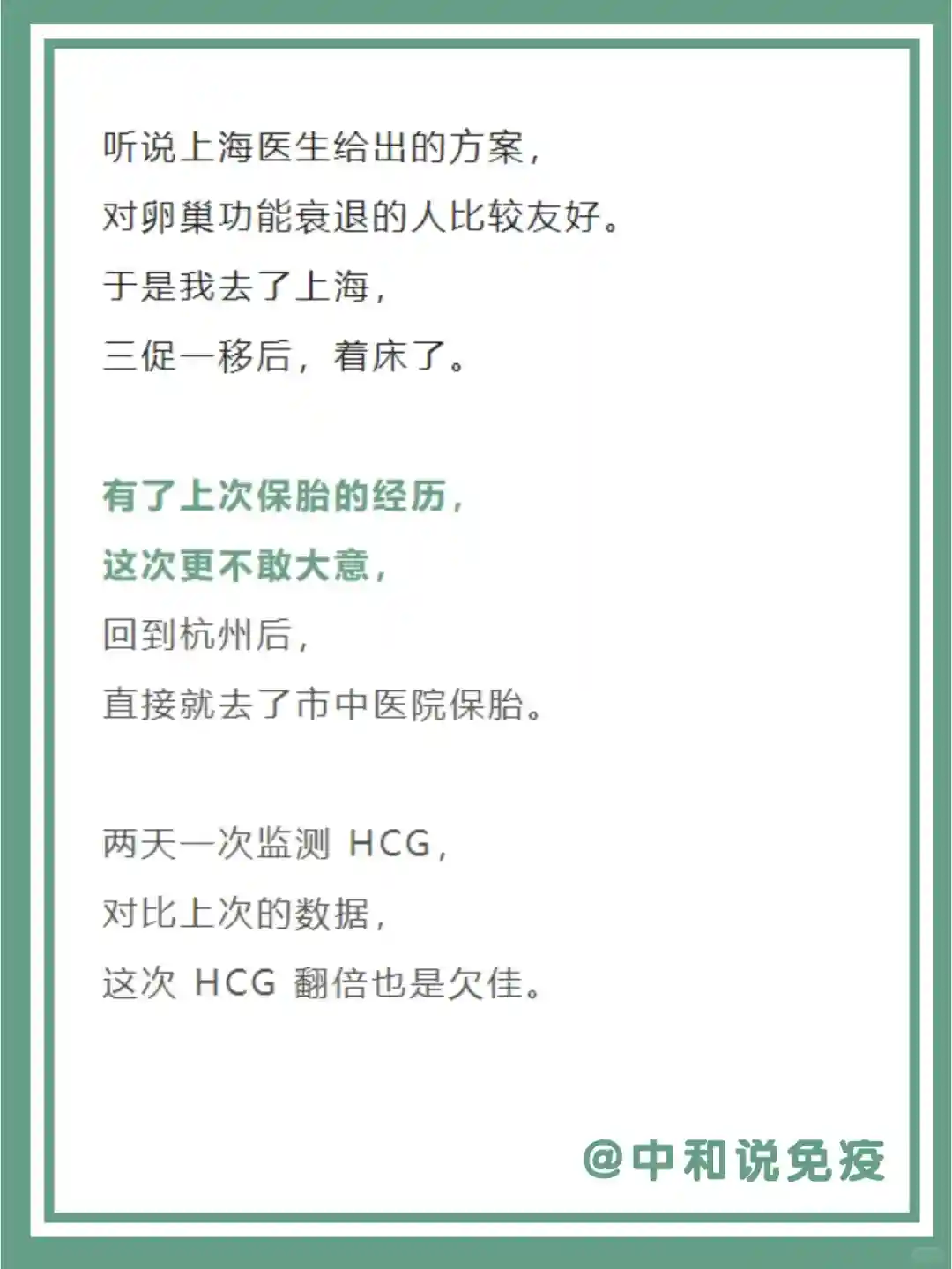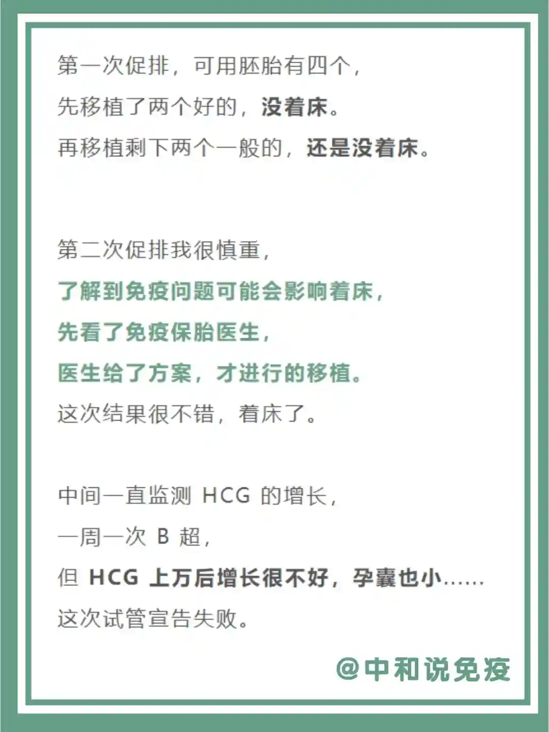 第二次促排我很慎重,了解到免疫问题可能会影响着床,先看了免疫保胎医生,医生给了方案,才进行的移植。这次结果很不错,着床了。