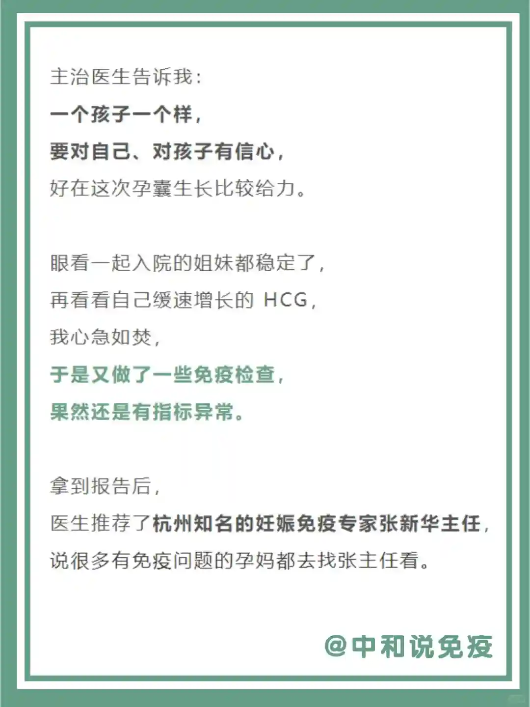又做了一些免疫检查做排查,果然还是有指标异常,医生给我推荐了杭州知名的妊娠免疫专家张新华主任,说很多有免疫问题的孕妈都去找张主任看。