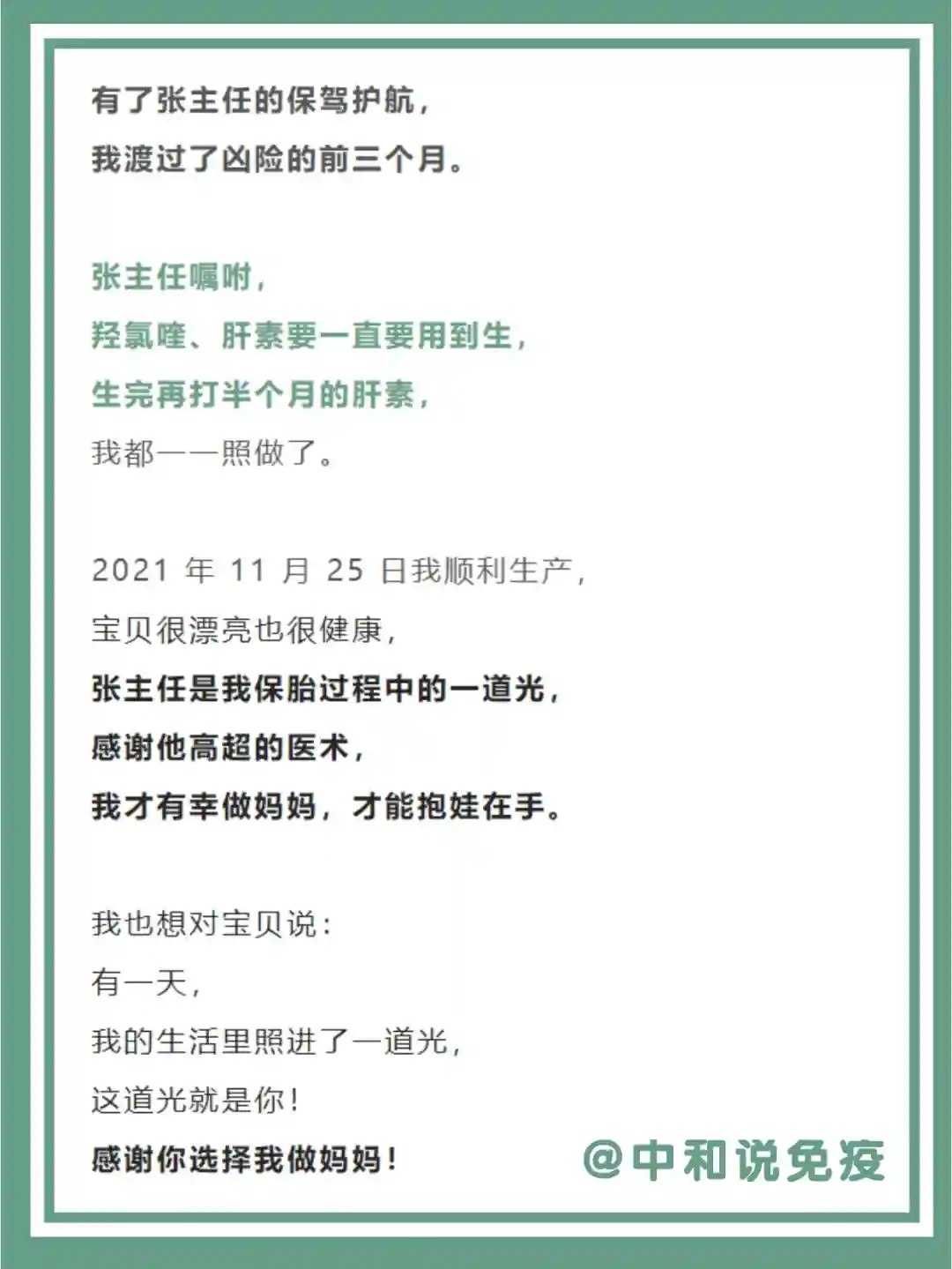 果然厘清病因,对症治疗,就是好孕的开始,有了张主任的保驾护航,我渡过了凶险的前三个月。张主任嘱咐,羟氯喹、肝素要一直要用到生,生完再打半个月的肝素,我都一一照做了。
