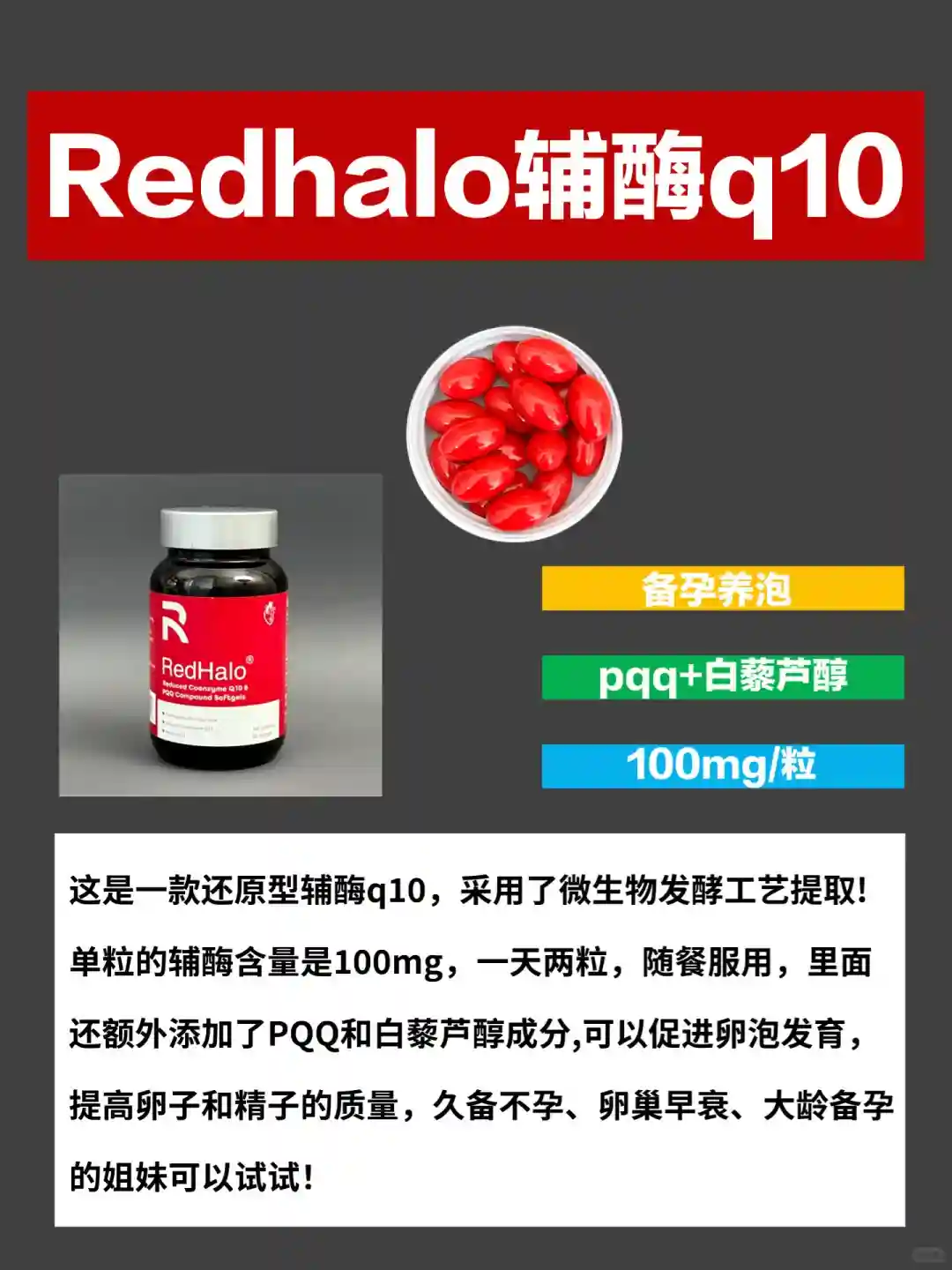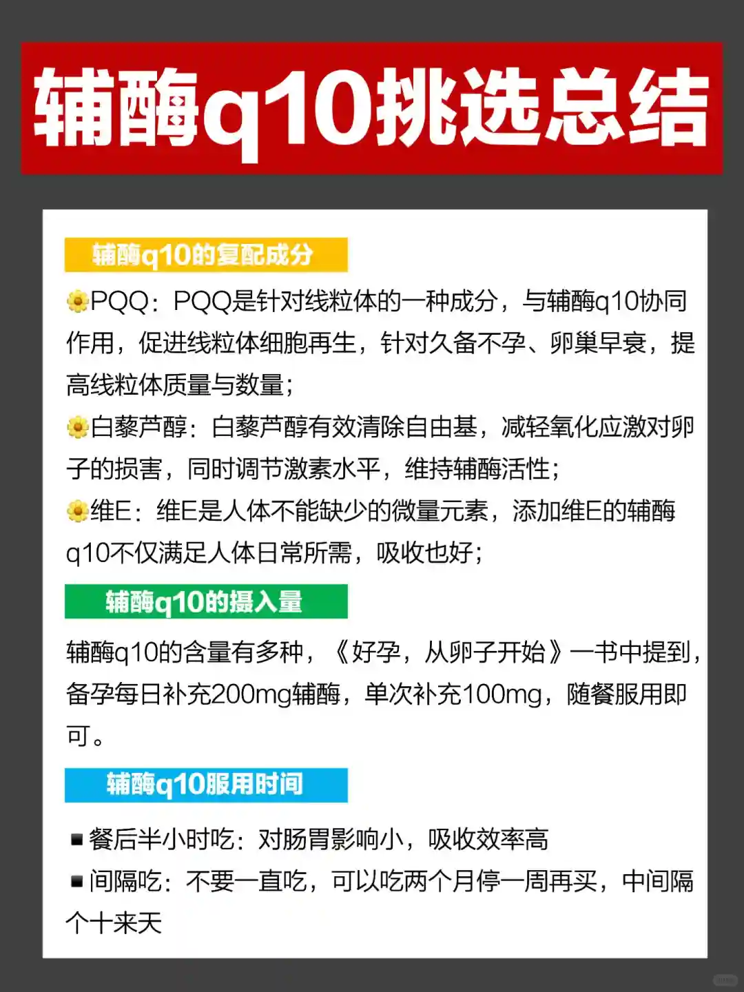 辅酶q10的含量有多种,但不是越高就越好,含量过高会给自己增加吸收负担,含量过低容易补充却不到位,《好孕,从卵子开始》一书中提到,备孕每日补充200mg辅酶,单次补充100mg,随餐服用即可。