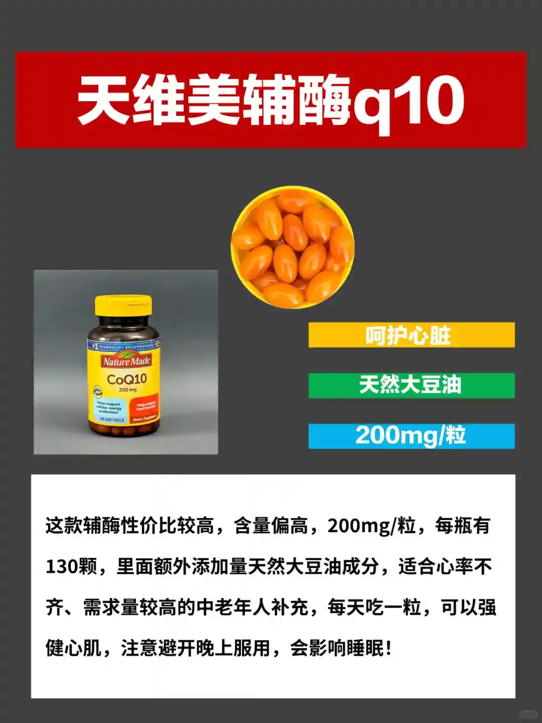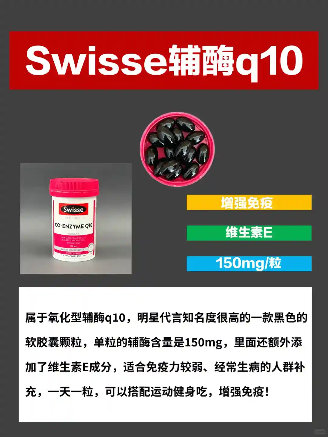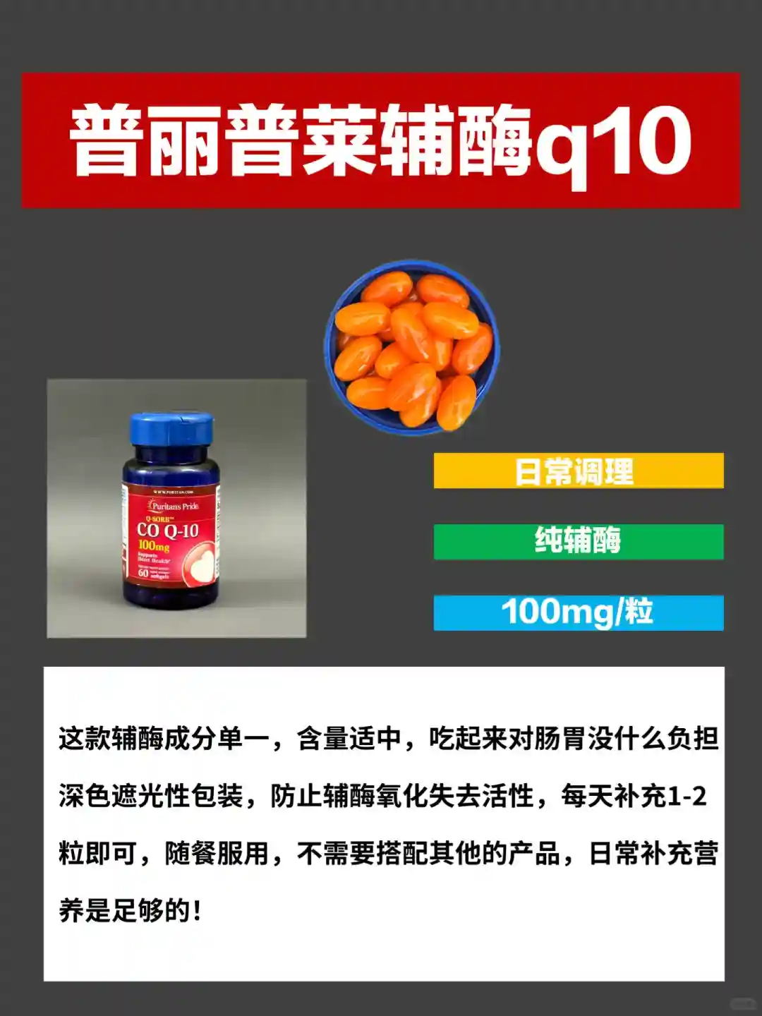 🌼维E:维E是人体不能缺少的微量元素,添加维E的辅酶q10不仅满足人体日常所需,吸收也好;🏻辅酶q10每天摄入量