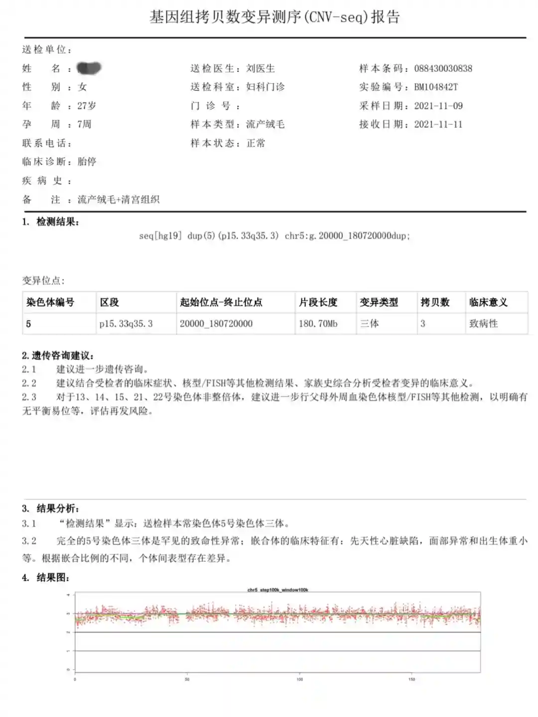 💔这一次胚胎送去检查了,结果出来显示5号染色体三体,上网查了很多,白大褂也说即便孩子保住了,生下来也会有缺陷,年后我和老公做了基因检查都没有问题,也许缘分还没到吧,其他的检查也没有做,那个时候也不准备要