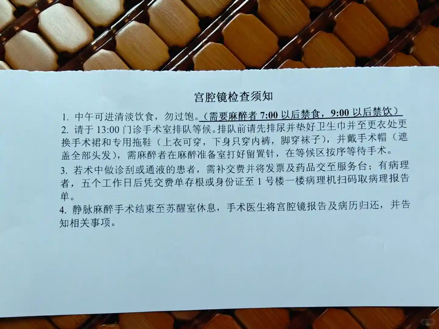 提前一天挂了早上九点不孕不育普通号,早上七点前吃早饭,因为全麻七点后禁食,九点后禁饮,到医院后先到医生那里取白带,触诊,说是半个小时出报告,但我的看十分钟就出来了,拿着报告去找医生开宫腔镜的单子,开好单子二楼拿药,拿完药去三楼护士台登记,询问要不要麻醉,那肯定要啊,登记完挂麻醉门诊,去四楼找医生开麻醉药,药不用拿,然后拿着之前医生开的药交到门诊手术室,让下午一点在门口等叫,上午流程就这样结束了。