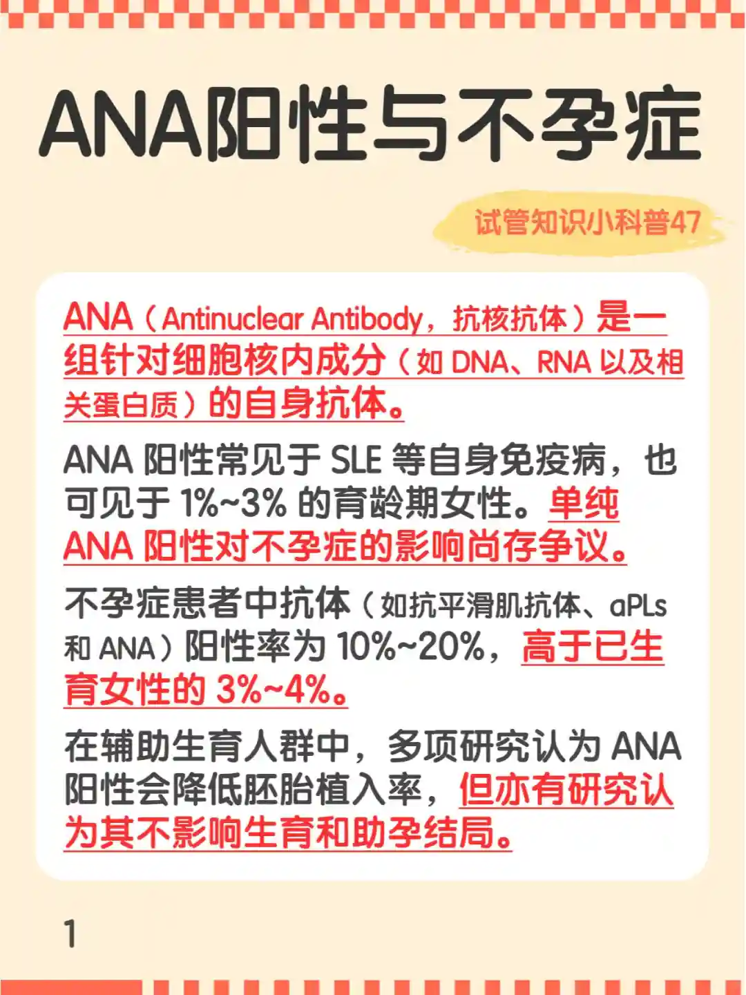 👶 不过,有研究指出,单纯ANA阳性和不孕症的具体关系尚存争议。尽管在不孕症人群中,ANA阳性率大约10%-20%,显著高于已经生育女性的3%-4%。