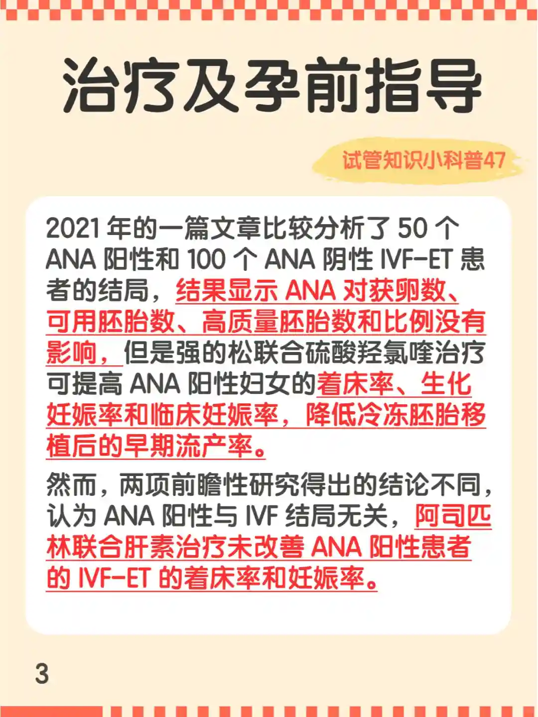 ❗ 值得注意,两篇前瞻性研究指出,某些治疗(如阿司匹林联合肝素)未明显改善ANA阳性患者的试管结局,因此需要因人而异。