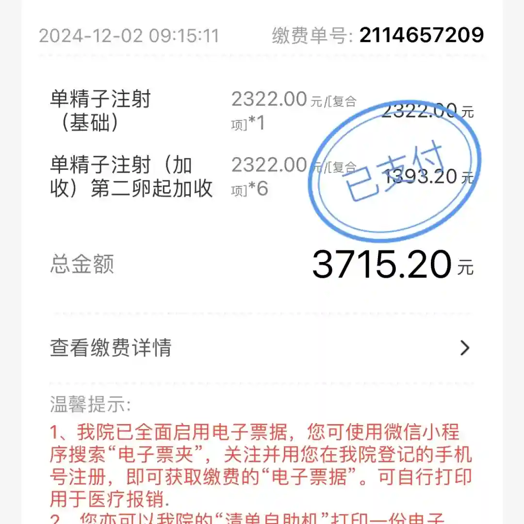 App会推缴费信息,如果不是广州医保,可以直接手机缴费,广州医保需要到医院四楼拿缴费单,然后到收费处缴费。7个的费用是3715.2元,报销完是534.41,加上取卵手术报销的钱,目前大概省了一万左右。