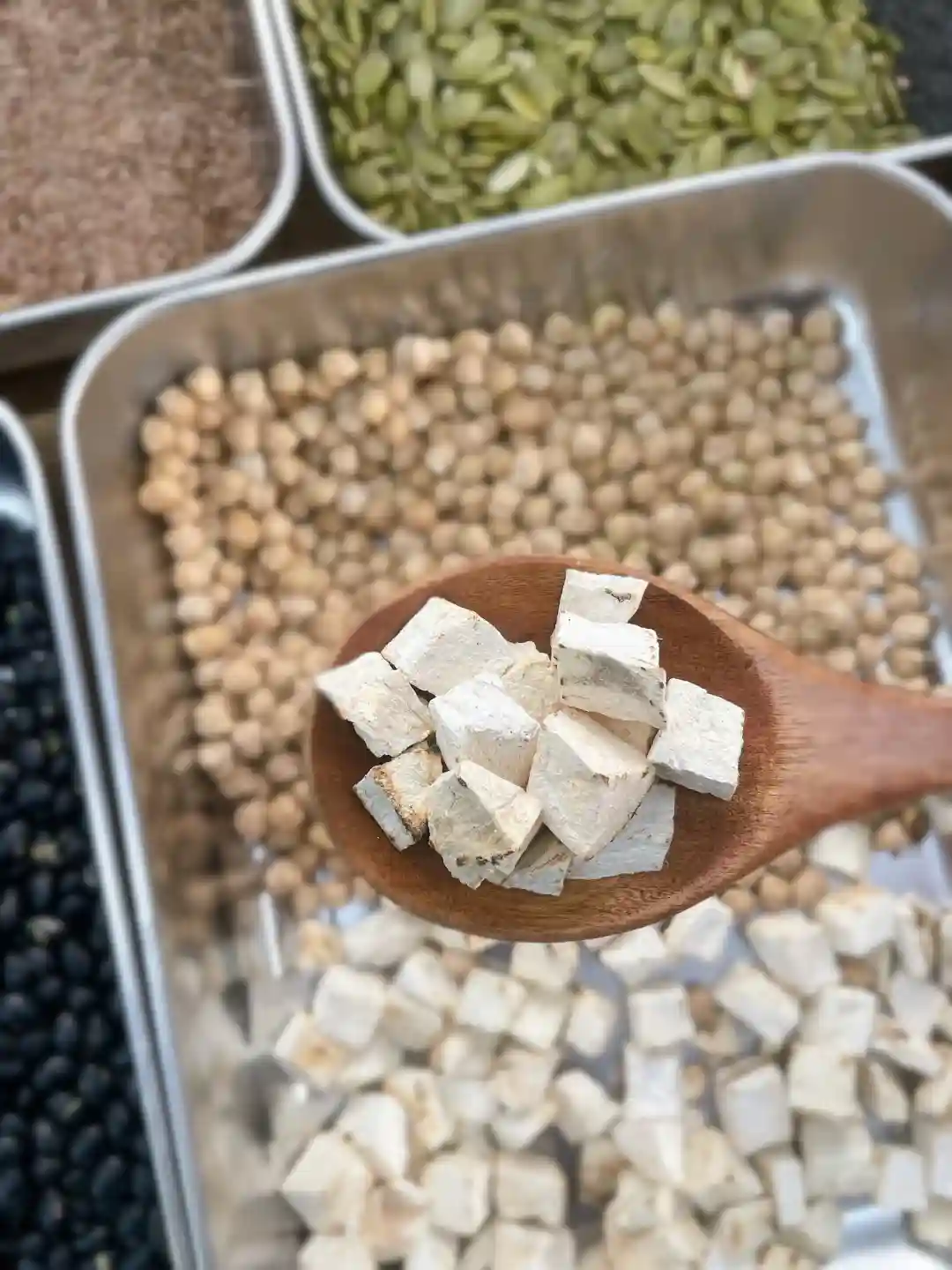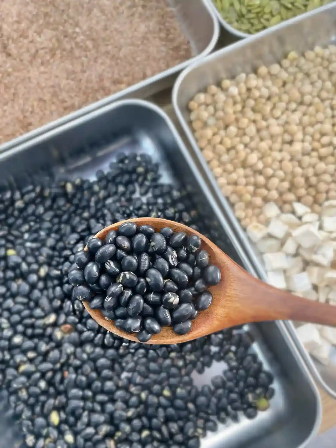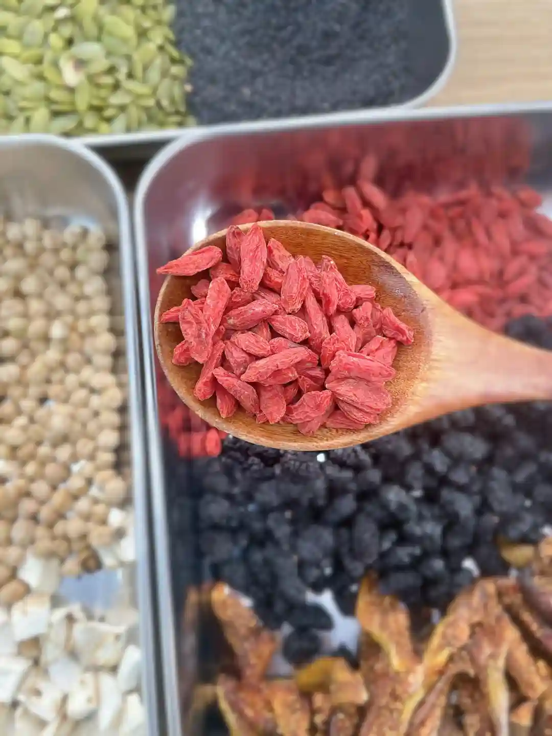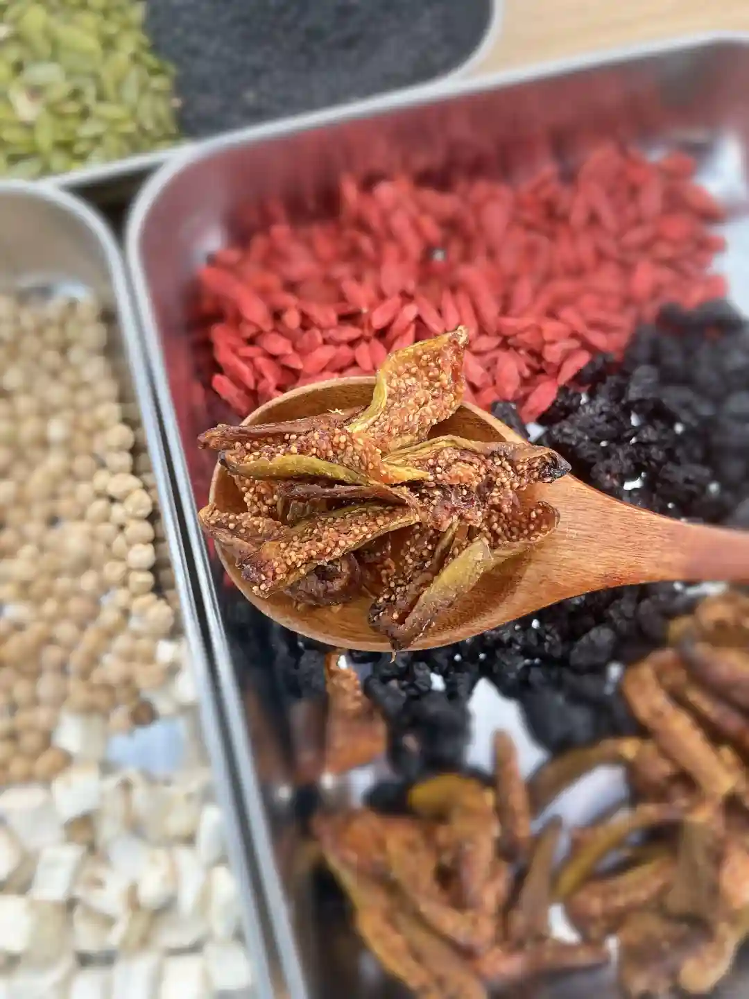 改良版种子循环法,采用药食同源食材磨粉,更利吸收:无花果 、亚麻籽、鹰嘴豆 、黑豆 、黑桑葚 、南瓜子 、黑芝麻、红枸杞 、葛根。黑豆、葛根、黑芝麻、鹰嘴豆、南瓜子、亚麻籽需先炒熟再磨粉。