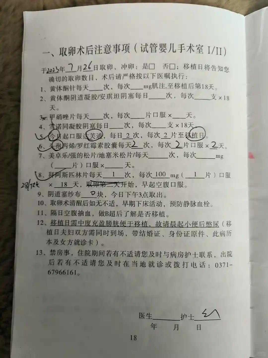 促排14天,24号25号:住院,第一天有个冲洗,跟刷马桶一样,晚上医生会告知一个确切的时间,去打夜针,不能迟到,打完第二天是观察,在取卵前,不要剧烈运动,行动尽量缓慢避免卵泡破了太多,也不能便秘,河医住院部条件还可以,取卵前一天,可以洗头洗澡,而我!简直咯!准备洗之前突然又发烧了、拉肚子,呕吐,随即被隔离到单间享受VIP待遇,不出意外又病毒感染了,虽然试纸条咋都测不出来,咳嗽严重,各种吐和头疼,所幸发烧没有超过38度还是能够取卵的。