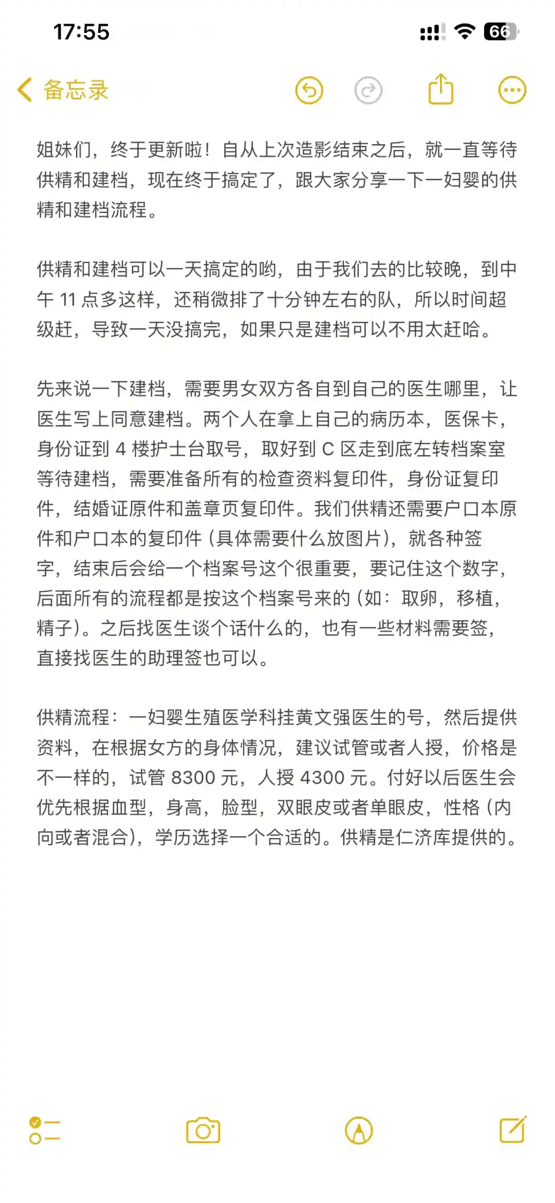 供精流程:一妇婴生殖医学科挂黄文强医生的号,然后提供资料,在根据女方的身体情况,建议试管或者人授,价格是不一样的,试管 8300 元,人授 4300 元。付好以后医生会优先根据血型,身高,脸型,双眼皮或者单眼皮,性格(内向或者混合),学历选择一个合适的。供精是仁济库提供的。#供精试管婴儿 #备孕日记