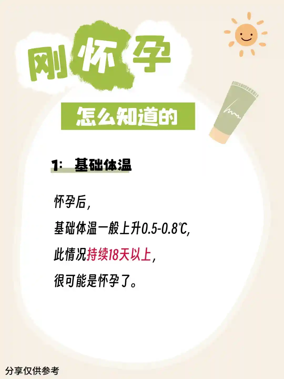 1️⃣基础体温。怀孕后,基础体温一般上升0.5-0.8℃,此情况持续18天以上,很可能是怀孕了。