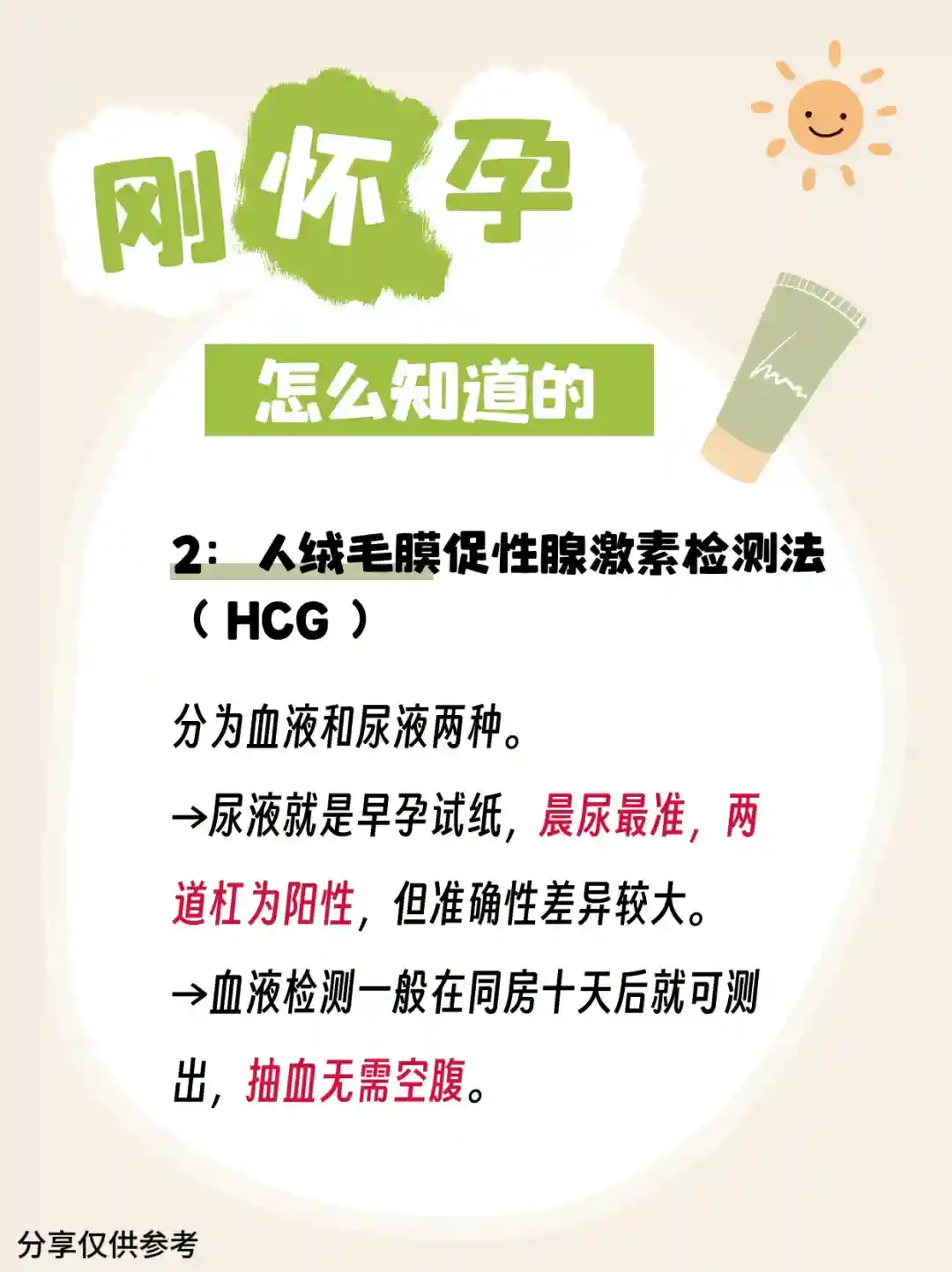 2️⃣人绒毛膜促性腺激素检测法(HCG)。分为血液和尿液两种,尿液就是早孕试纸,晨尿最准,两道杠为阳性,但准确性差异较大。血液检测一般在同房十天后就可测出,抽血无需空腹。