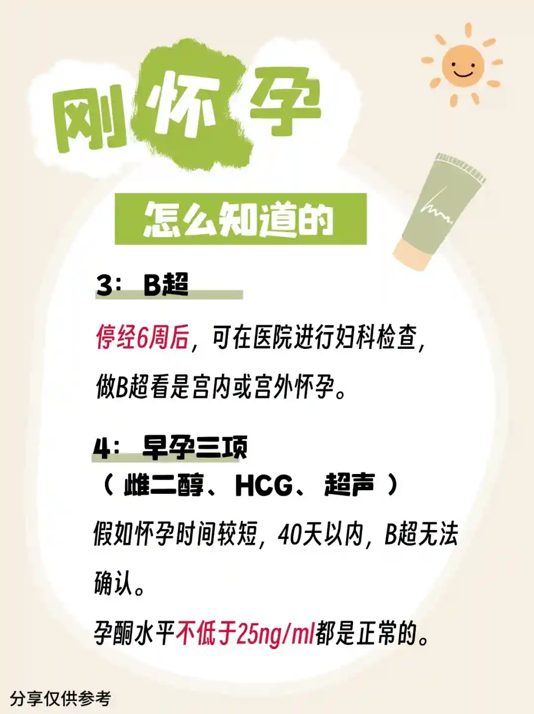 4️⃣早孕三项(雌二醇、HCG、超声)。假如怀孕时间较短,40天以内,B超无法确认。孕酮水平不低于25ng/ml都是正常的。