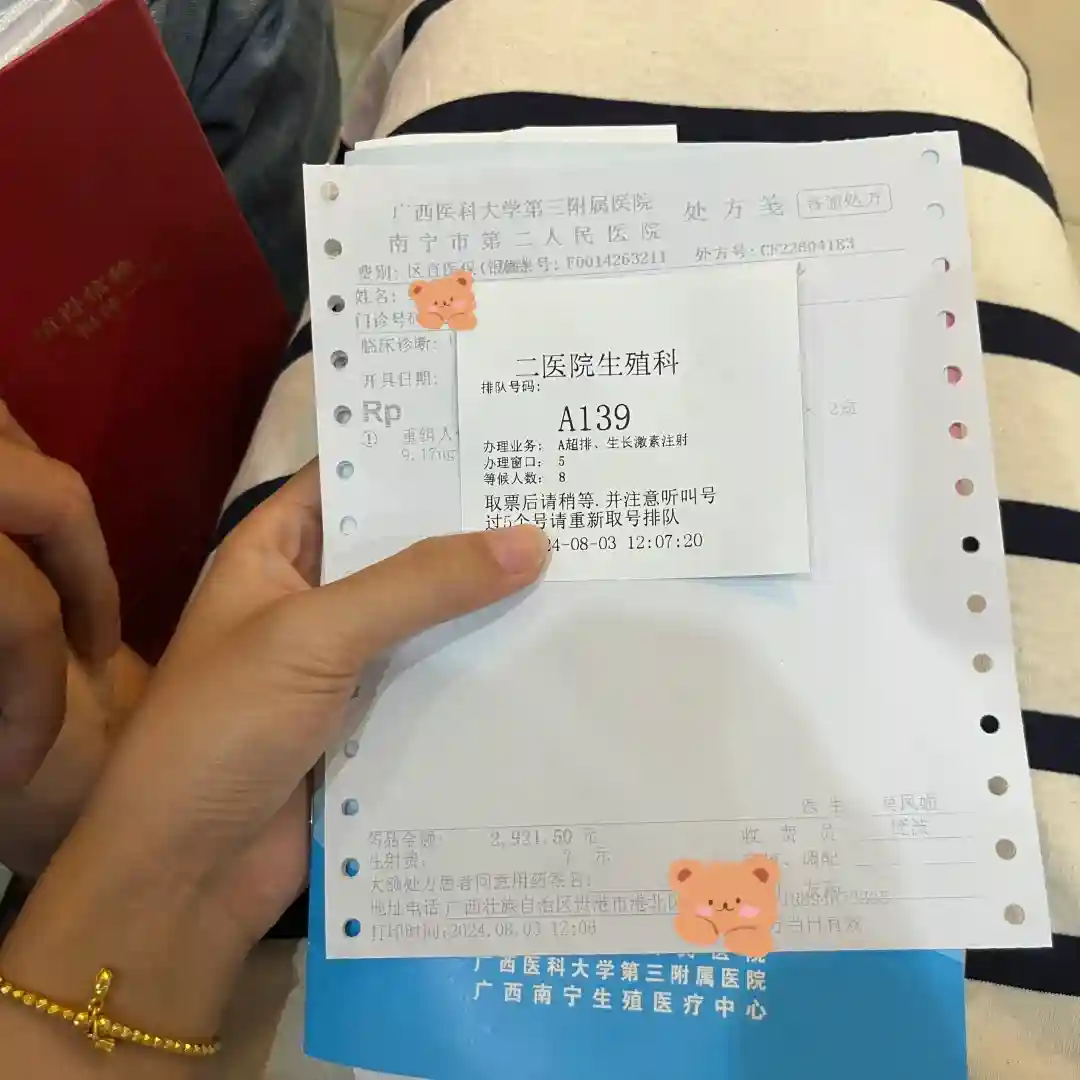 1⃣️2号终于来大姨妈返院检查➕促排了。进周第一次b超要等预约号的检查完才到二楼妇科转号上去的,这一等就是等到了12点才到我医生说有30个🫧这样,开了四天果纳芬,我外地的去南宁打针太麻烦了,所以就带回家里打了。