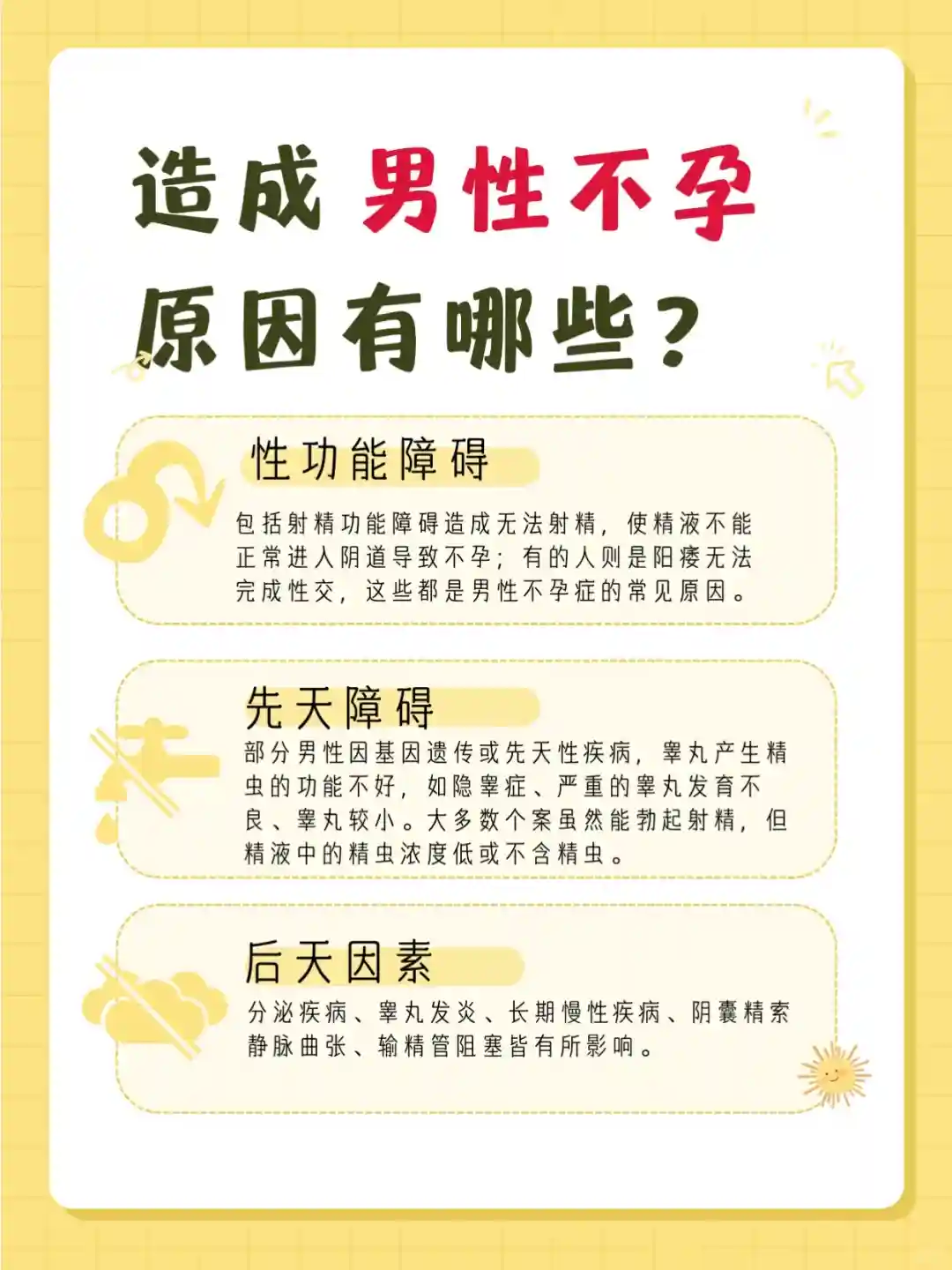 但是,有时基础疾病(例如遗传性疾病、激素失衡、睾丸周围静脉扩张或者阻塞输精管的状况)会导致体征和症状。