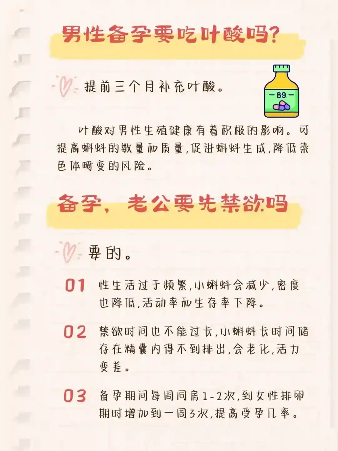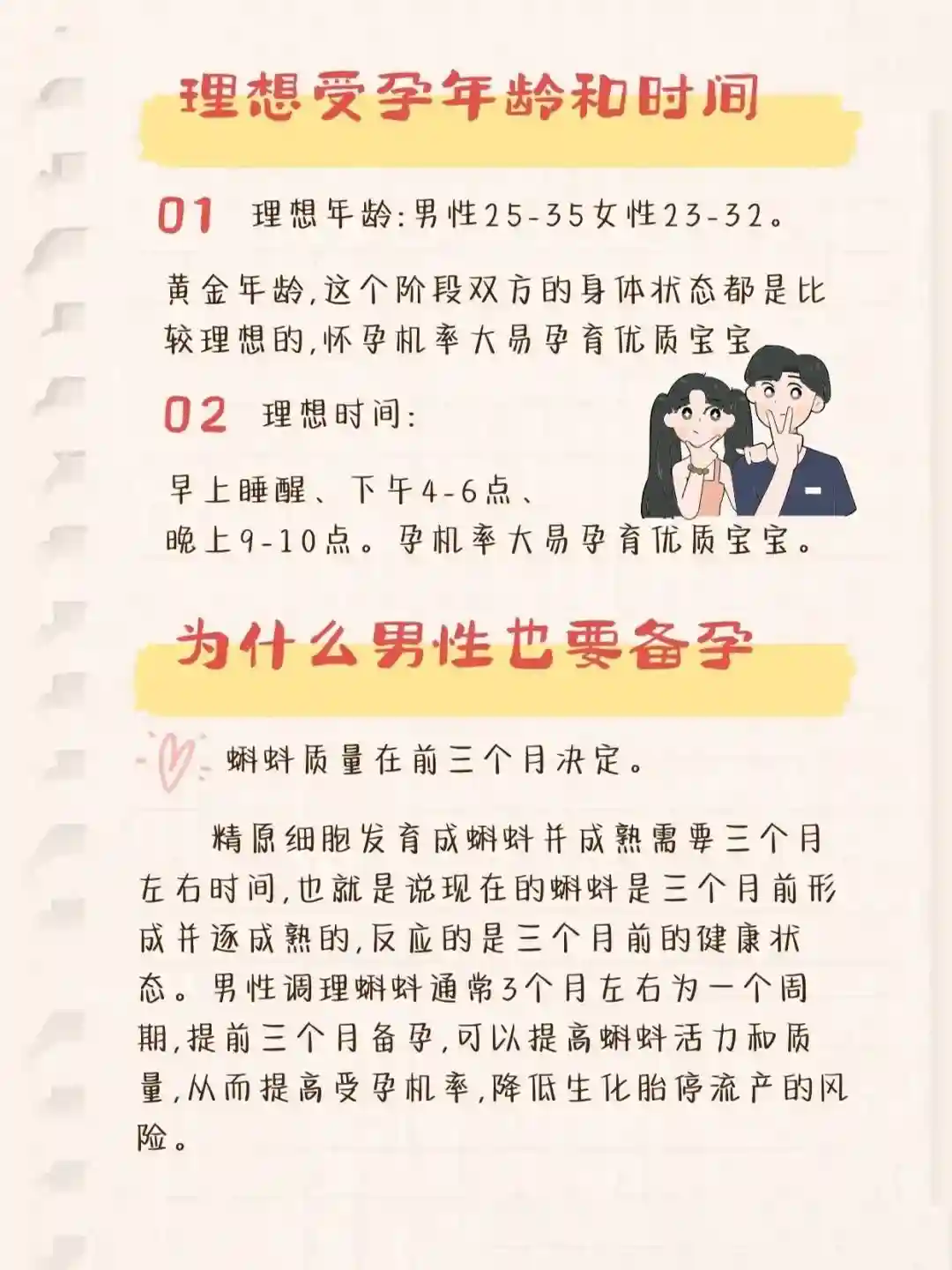 - 理由:精子质量由前三个月的健康状态决定,提前三个月备孕能提高受孕几率。