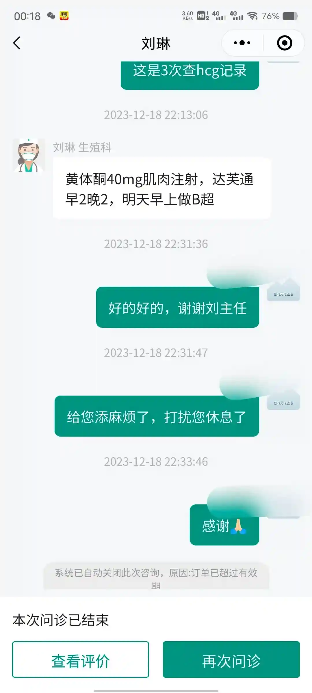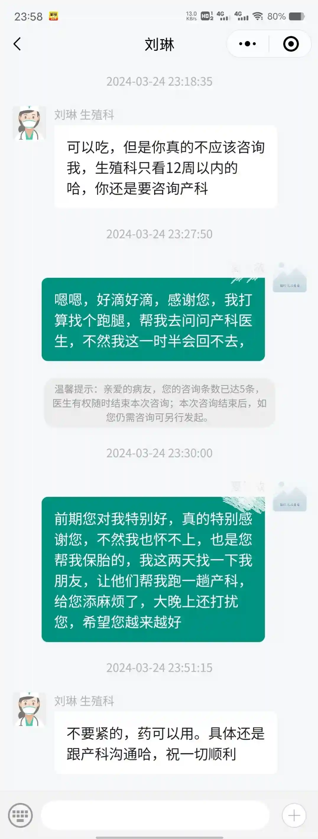 6、后来顺利怀孕,因为自己有积液,也流过鲜血。刘琳一直给我保胎,打黄体酮,吃地屈孕酮片等药,相信很多孕妈妈都有过。包括有时候晚上出血,我都在线问诊,真的回复的很快,基本上半小时以内吧,而且好几次都是晚上10多点,这个点是下班的点,哪怕不回复消息,我也能够理解,毕竟这是医生的下班时间,是有权利不回复的。