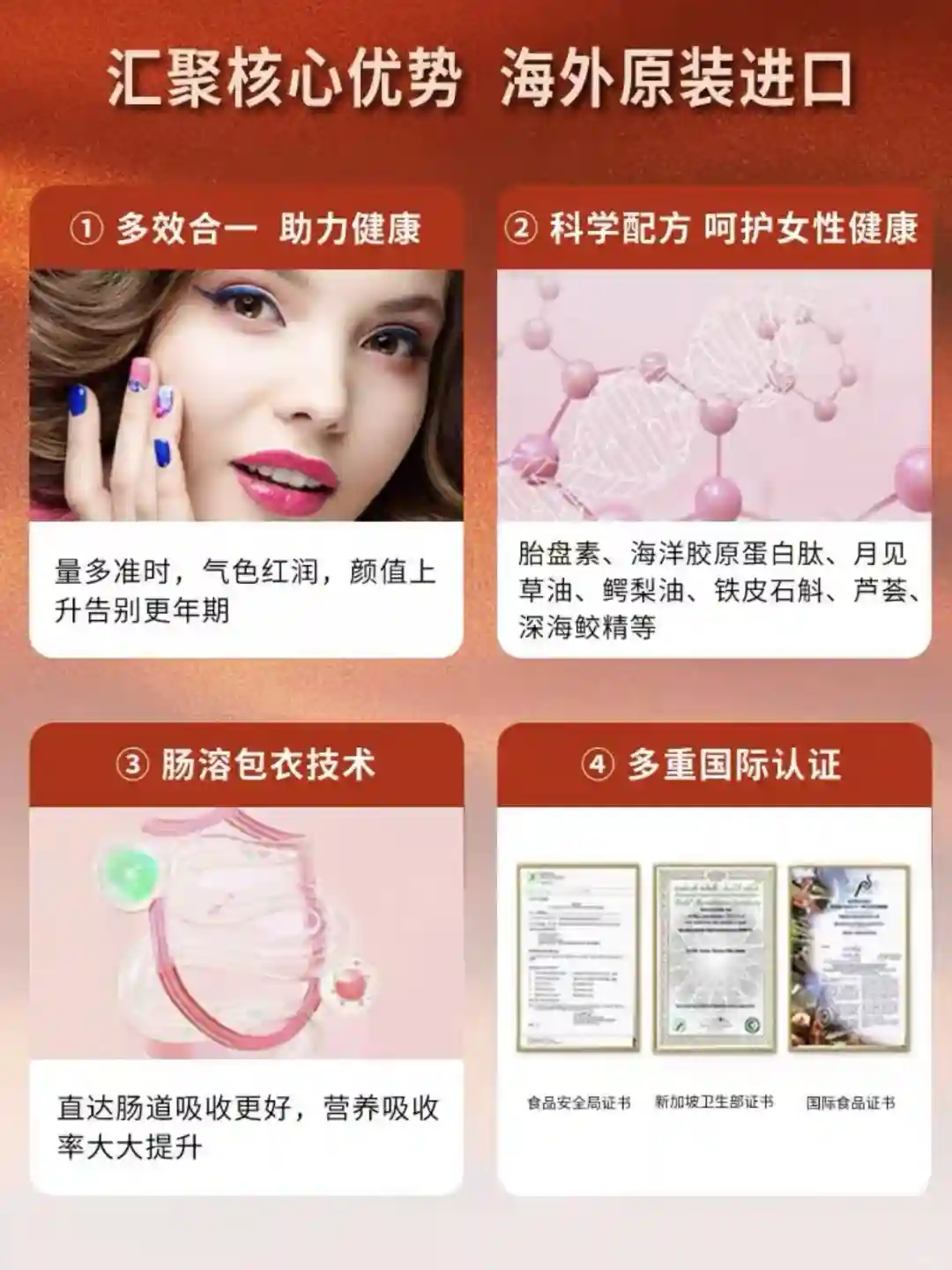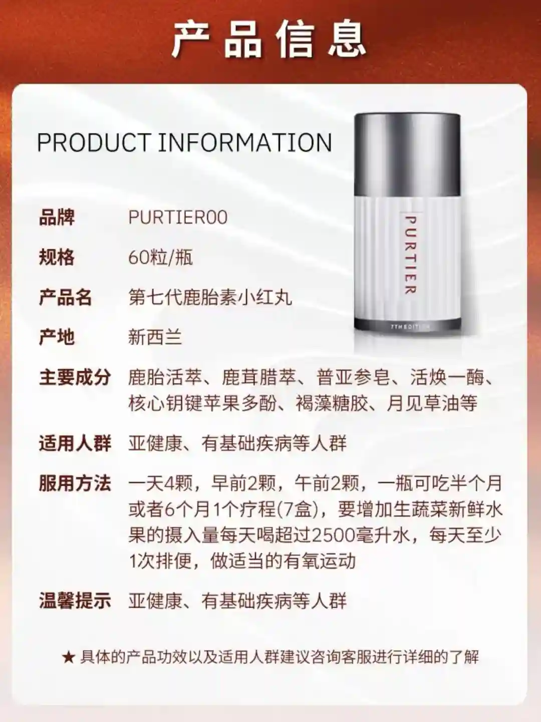 这款purtier新加坡鹿胎素主要成分有鹿胎活萃、鹿茸腊萃、普亚参皂、活焕一酶、核心钥键苹果多酚、褐藻糖胶、月见草油等都是有益于女性健康的原料大家可以放心食用