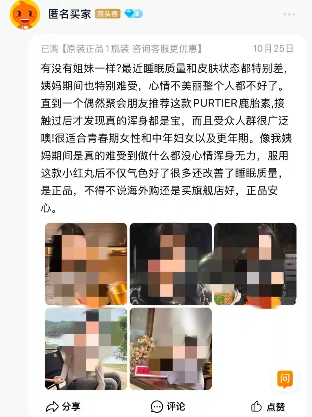 我现在的仗着自己年轻就熬夜霍霍,没注意到保养养生,最近大姨妈开始不稳定,才开始重视起来,听别人分享用了这款purtier新加坡的鹿胎素,服用一段时间后身边很多朋友都夸我皮肤变好了,现在姨妈和规律不疼了,希望继续使用能体验到更好的效果,这家的货不错,包装完好,瓶身干干净净,也没有什么磨损,吃着放心。