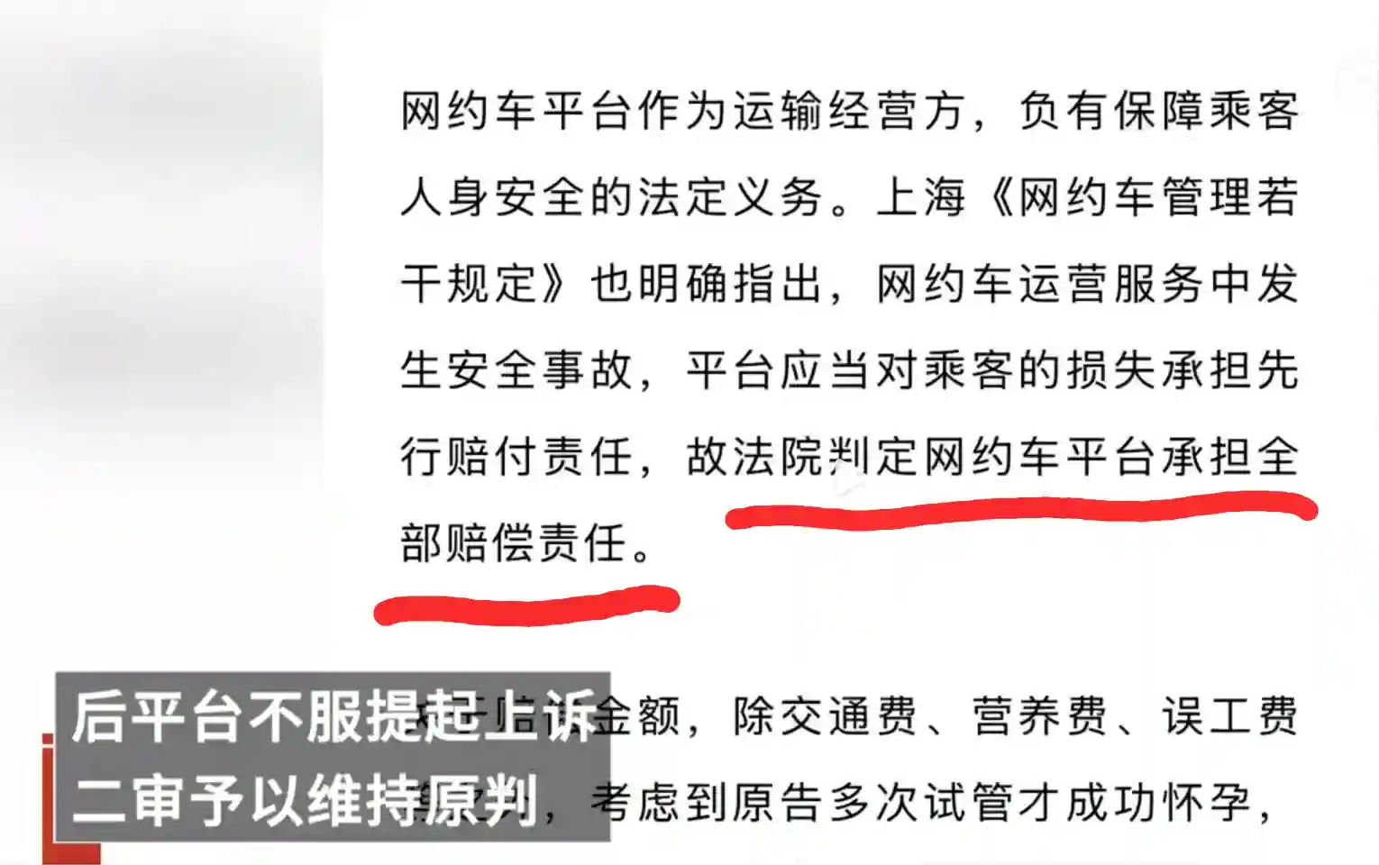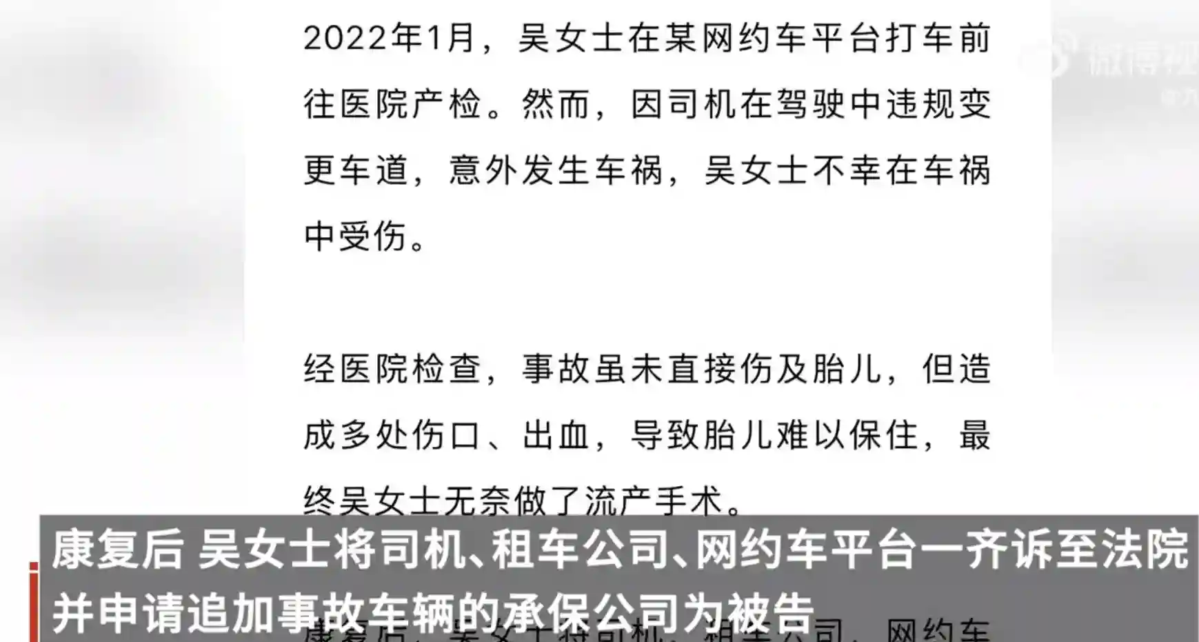 #提到了你#法律咨询#交通事故#律师【孕妇乘网约车流产,法院:平台承担全部赔偿责任】2月17日,据上海高院:2022年1月,吴女士在某网约车平台打车前往医院产检。然而,因司机在驾驶中违规变更车道,意外发生车祸,吴女士不幸在车祸中受伤。经医院检查,事故虽未直接伤及胎儿,但造成多处伤口、出血,导致胎儿难以保住,最终吴女士无奈做了流产手术。康复后,吴女士将司机、租车公司、网约车平台一齐诉至法院,并申请追加事故车辆的承保公司为被告。浦东新区人民法院经审理后认为,原告通过网约车平台预定了网约车服务,双方之间形成公路旅客运输合同关系,而原告与保险公司、租车公司、司机并非合同相对方,上述三被告不应承担赔偿责任。网约车平台作为运输经营方,负有保障乘客人身安全的法定义务,故法院判定网约车平台承担全部赔偿责任。关于赔偿金额,除交通费、营养费、误工费等之外,考虑到原告多次试管才成功怀孕,此次事故虽未构成肢体伤残,但对其精神造成较大打击,故酌定精神损害抚慰金3万元,共计赔偿吴女士9万余元。