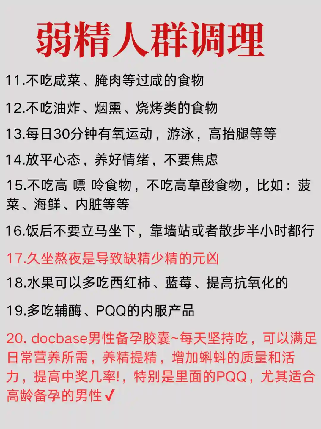 ✔查出弱精怎么办?不要担心,生活中补充营养,弱精是需要长期调理的,不建议药物,选不含激的内服会更好,日常调理的饮食和习惯在(图3、4)