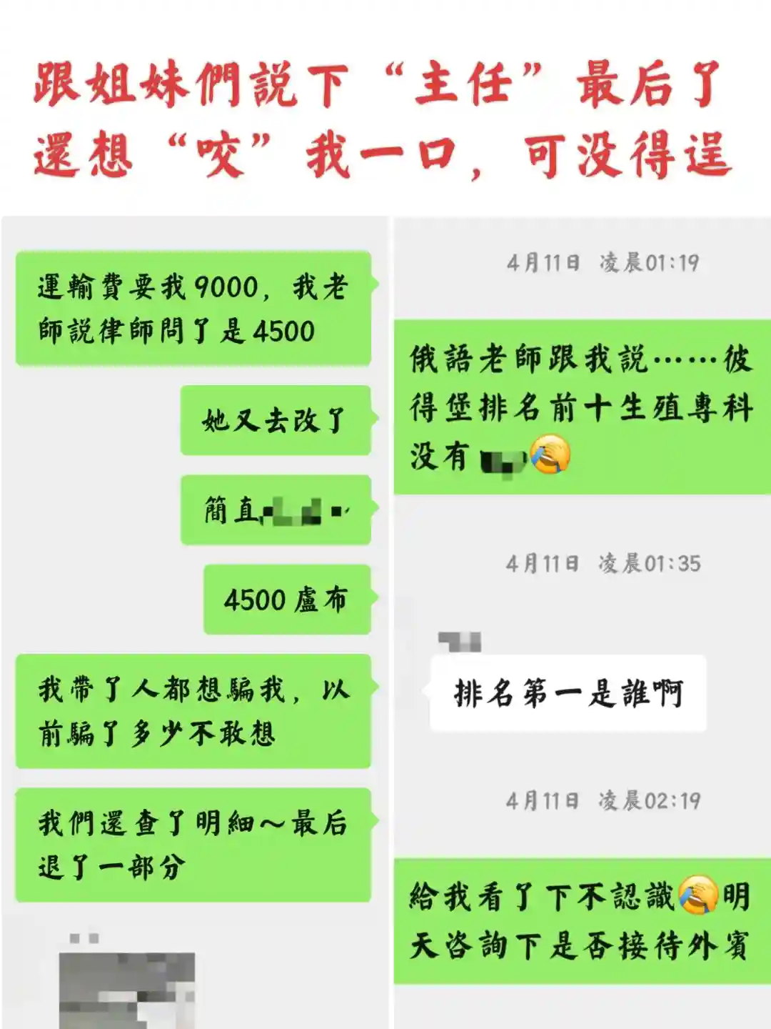 可是我欲包容忍让,网红诊所却得寸进尺——当我和Elena一起去办转移手续,虽然“主任”改口说收卢布了,但在我接过运费单准备签字时——Elena制止了我,并指着上面的“9k”质问“主任”——明明彼得堡市内运输官价是4.5k,为什么他们要9k?