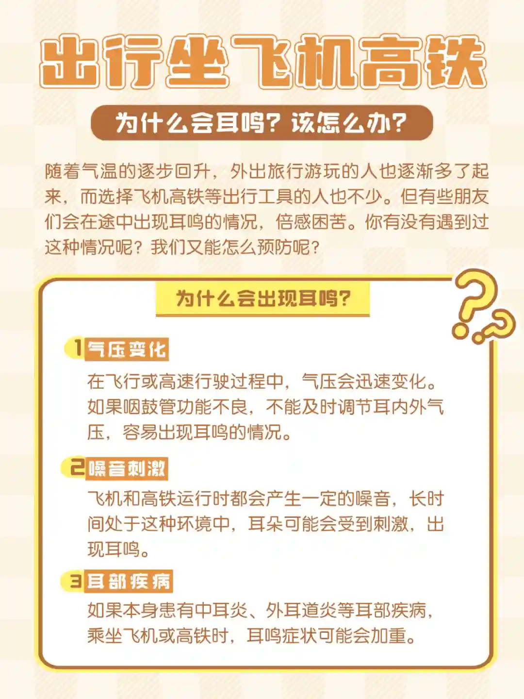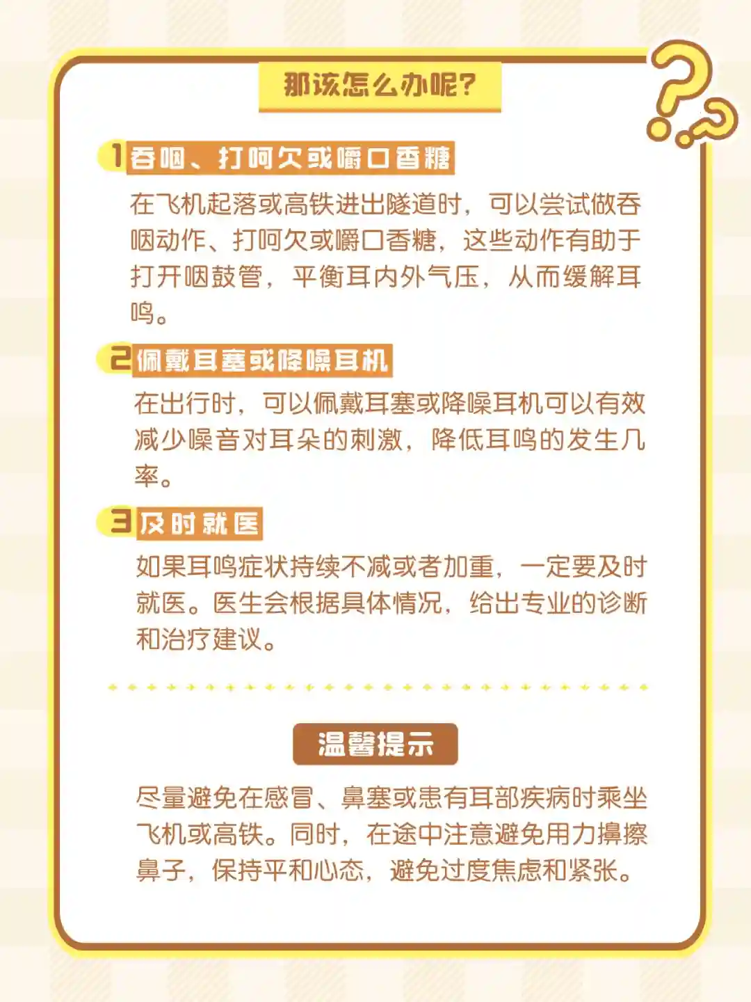 温馨提示:尽量避免在感冒、鼻塞或患有耳部疾病时乘坐飞机或高铁。同时,在途中注意避免用力擤擦鼻子,保持平和心态,避免过度焦虑和紧张