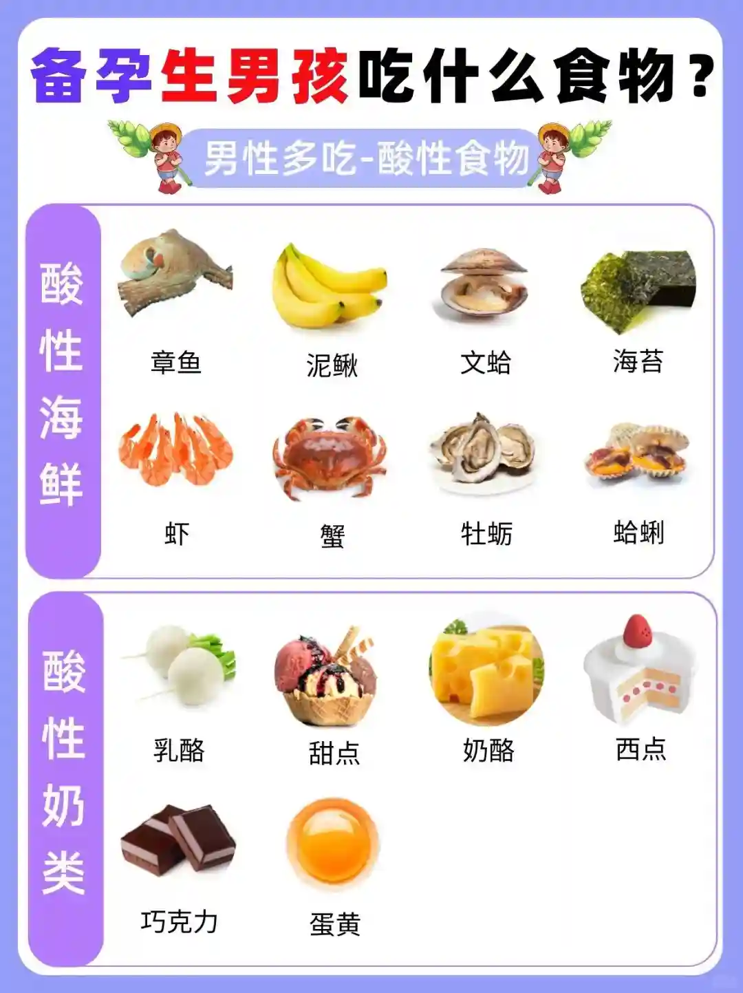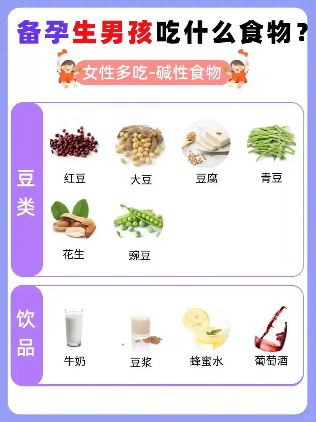 ⚠️一般来说男性多吃酸性食物,女性吃碱性食物,可以帮助生男孩,但不是百分之百💯