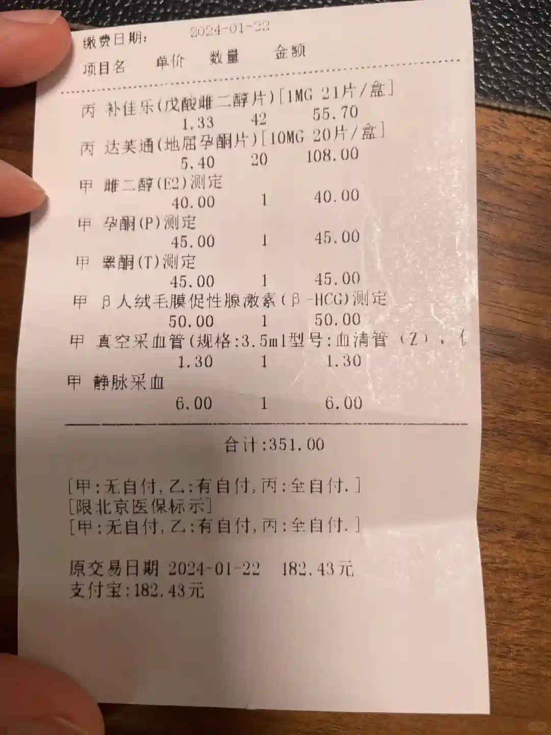 婷婷开了下次的挂号、验血、补佳乐和地屈孕酮,今日消费:合计351,自费182.43#北京协和试管 同济试管取卵后3天|返院看胚胎