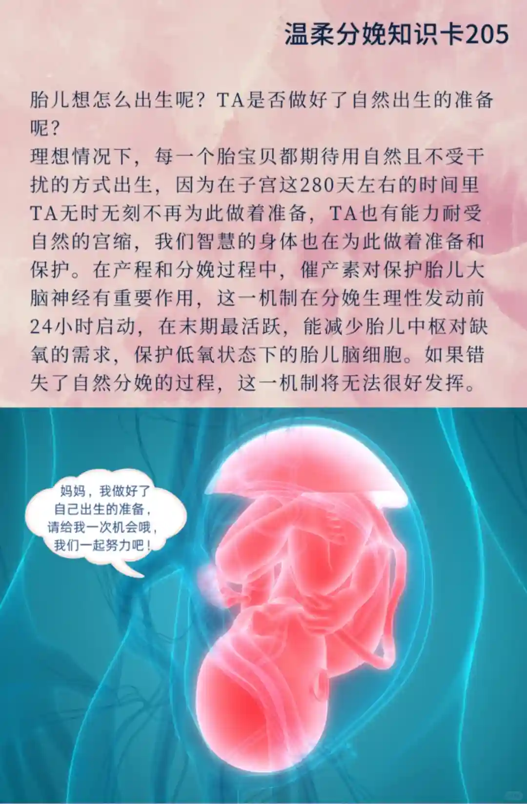 💗胎宝贝说:“妈妈,我做好了自己出生的准备,请给我一次机会哦,我们一起努力吧!”分娩不是妈妈一个人的事情,胎宝贝也在和妈妈一起努力,请听一听胎宝贝的心声。
