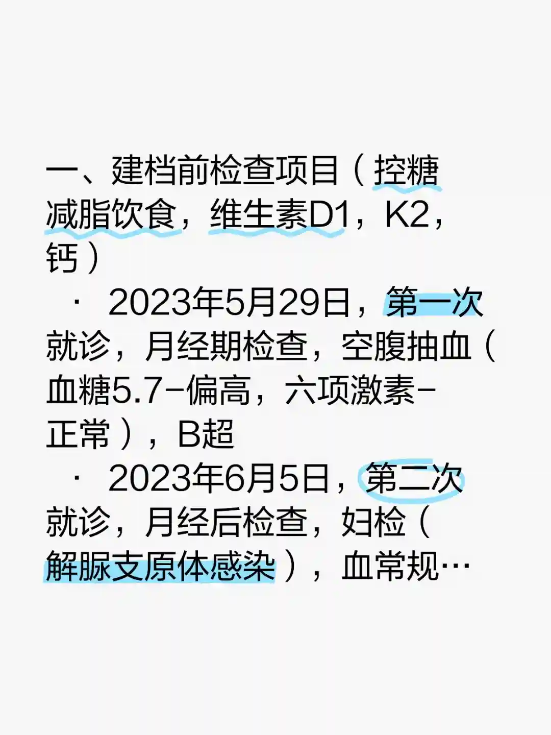 • 2023年5月29日,第一次就诊,月经期检查,空腹抽血(血糖5.7-偏高,六项激素-正常),B超